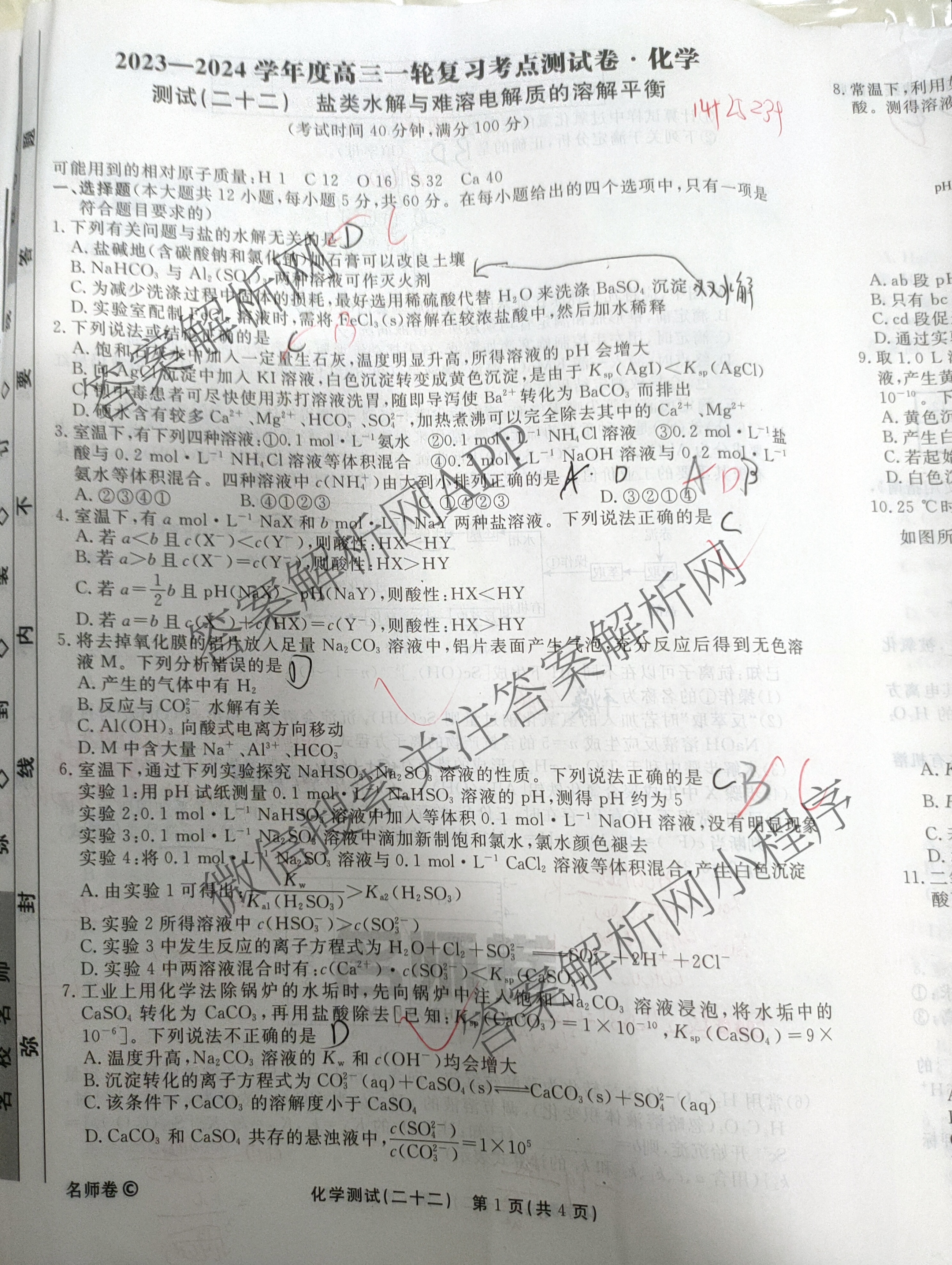 衡水名师卷2023-2024学年度高三一轮复习考点测试卷化学(二十二)22试题