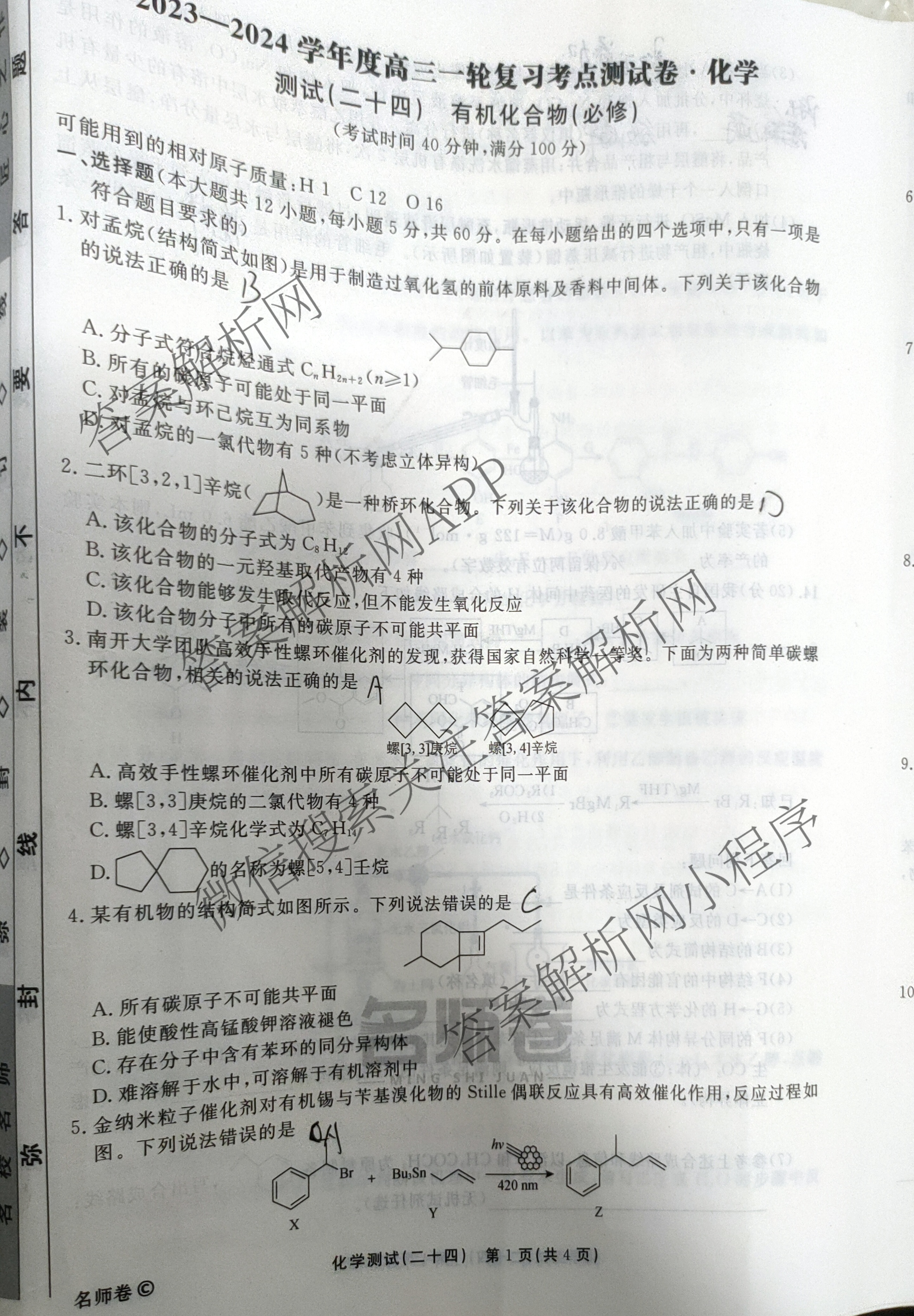 衡水名师卷2023-2024学年度高三一轮复习考点测试卷化学(二十四)24试题
