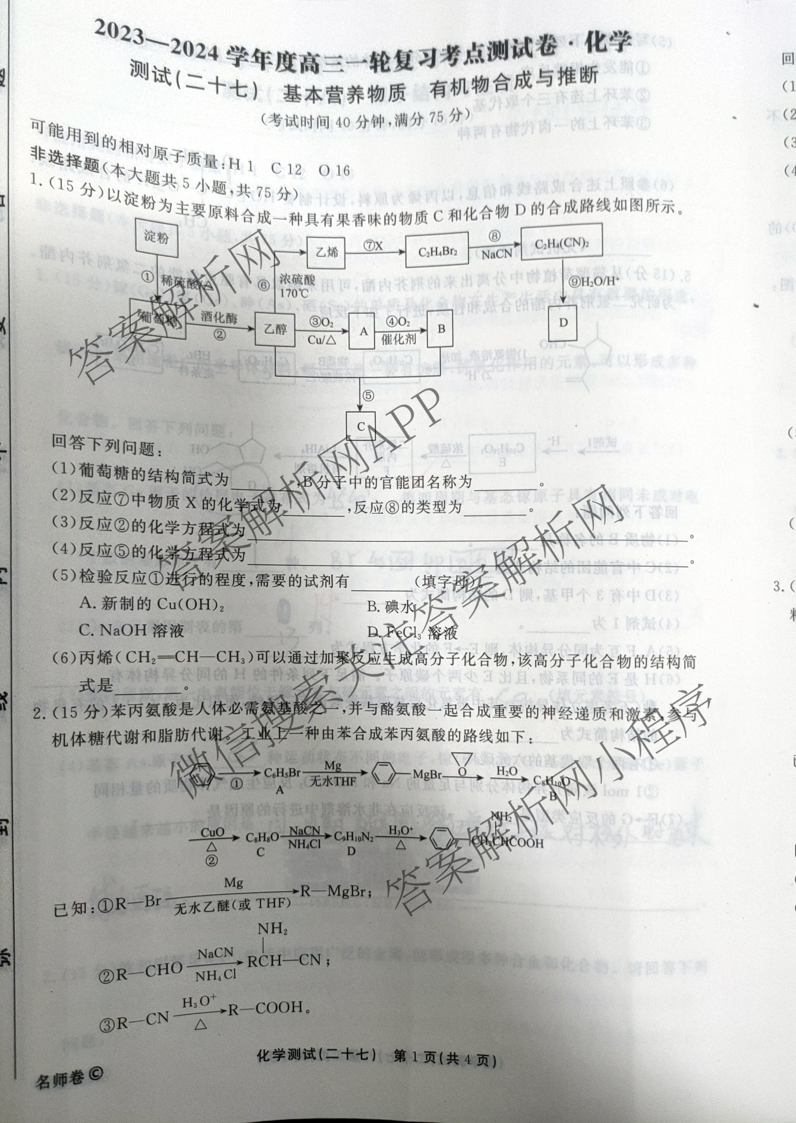 衡水名师卷·2023-2024学年度高三一轮复习考点测试卷·化学(二十七)27试题,目前分科卷答案网已经汇总了衡水名师卷·2023-2024学年度高三一轮复习考点测试卷·化学(二十七)27试题的各科答案和试卷,获取更多衡水名师卷答案解析,请在关注本站。