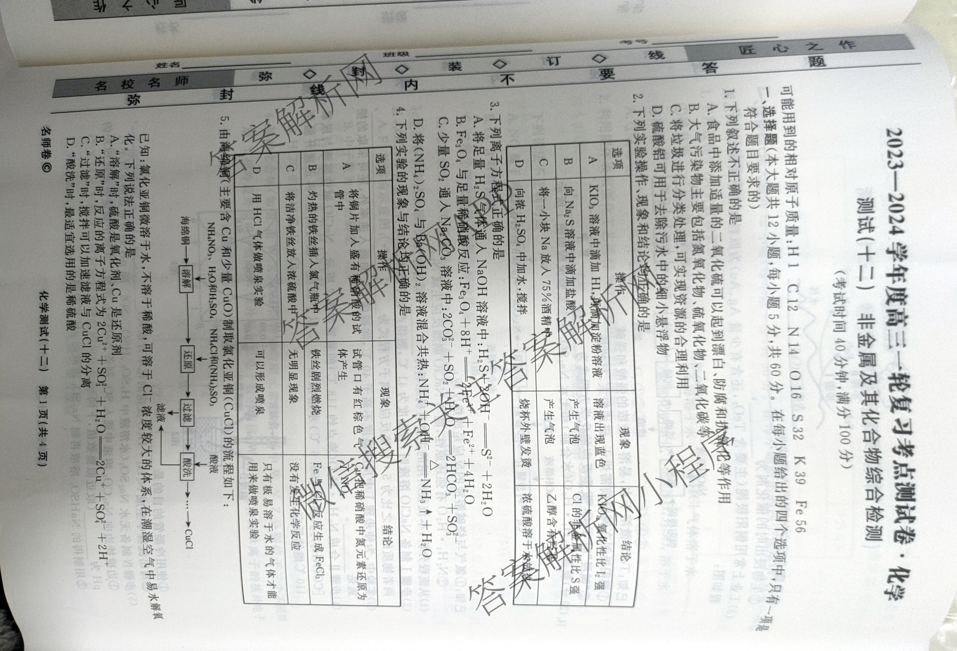 衡水名师卷2023-2024学年度高三一轮复习考点测试卷化学(十二)12试题