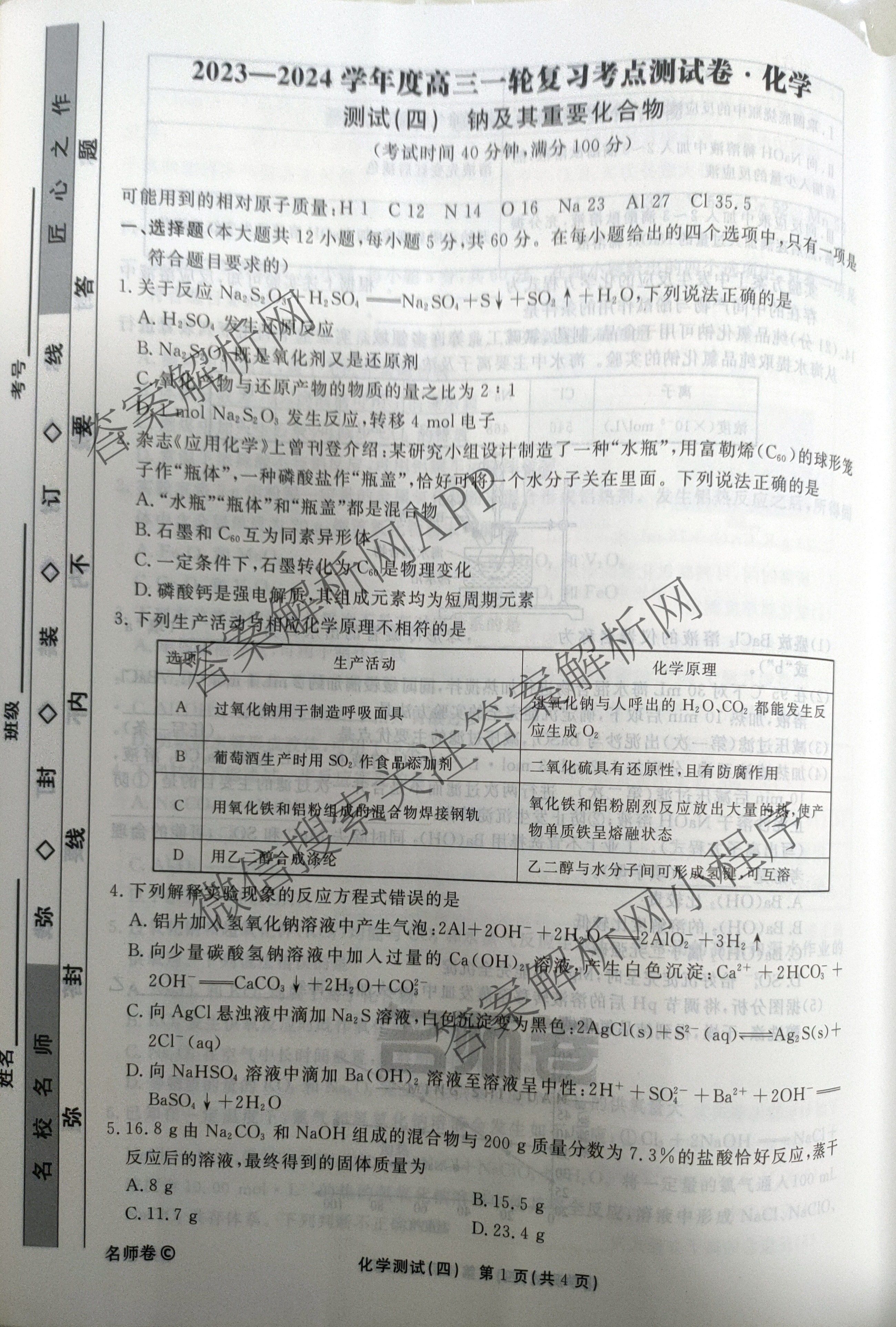衡水名师卷2023-2024学年度高三一轮复习考点测试卷化学(四)4试题