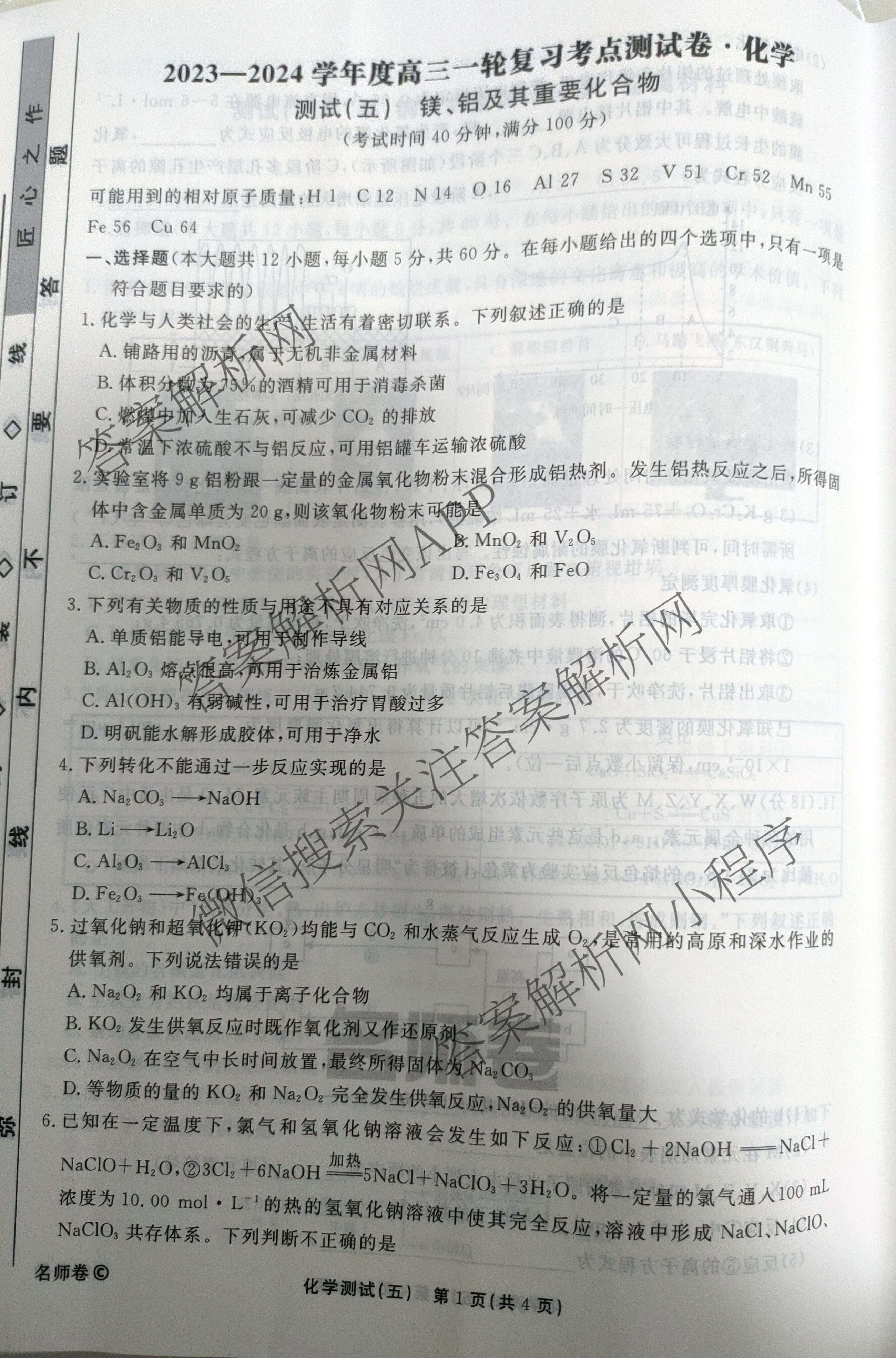 衡水名师卷·2023-2024学年度高三一轮复习考点测试卷·化学(五)5试题,目前分科卷答案网已经汇总了衡水名师卷·2023-2024学年度高三一轮复习考点测试卷·化学(五)5试题的各科答案和试卷,获取更多衡水名师卷答案解析,请在关注本站。