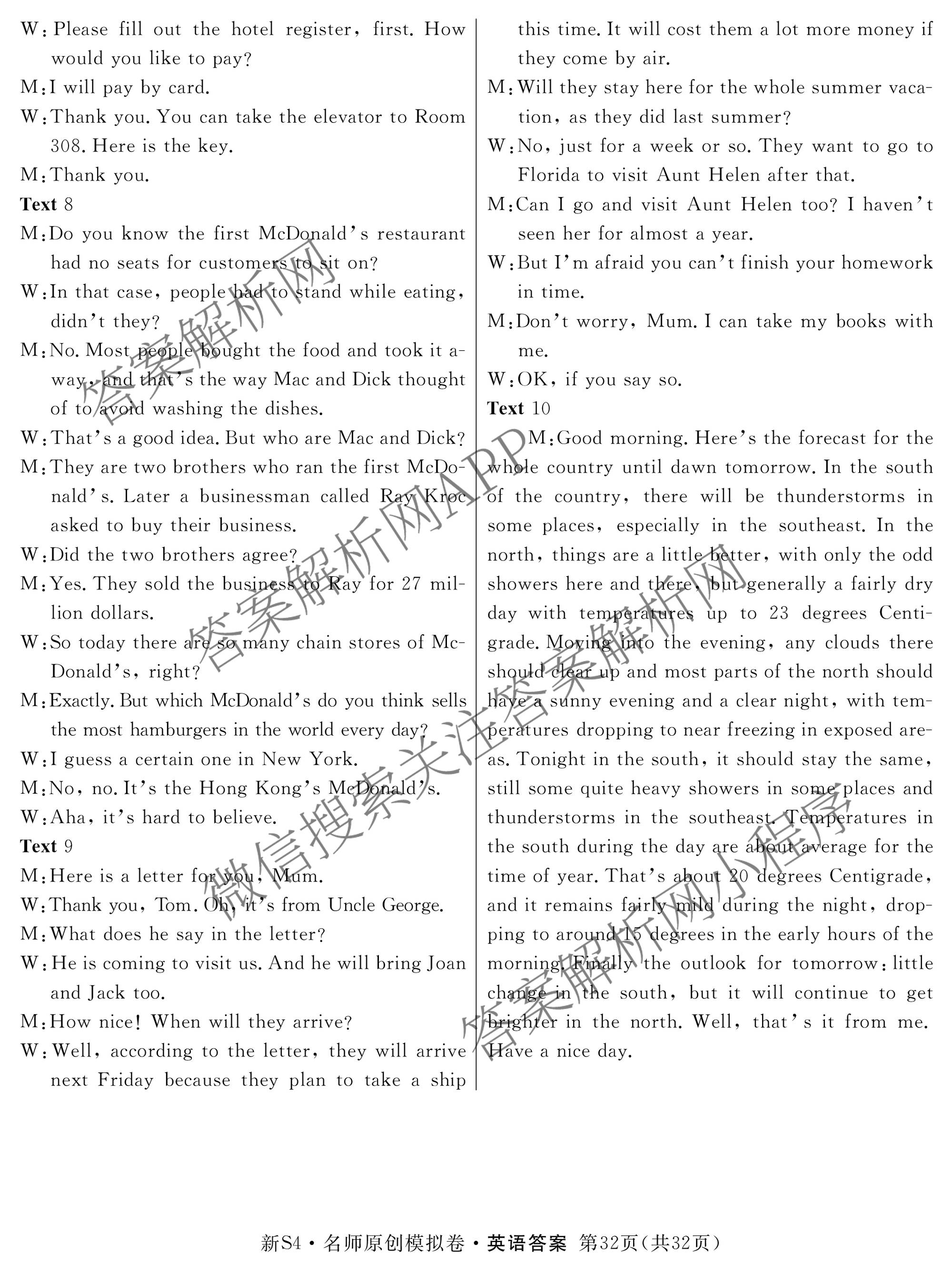 - [高三]2024届总复习·名师原创分科模拟(六)6英语(S4)答案