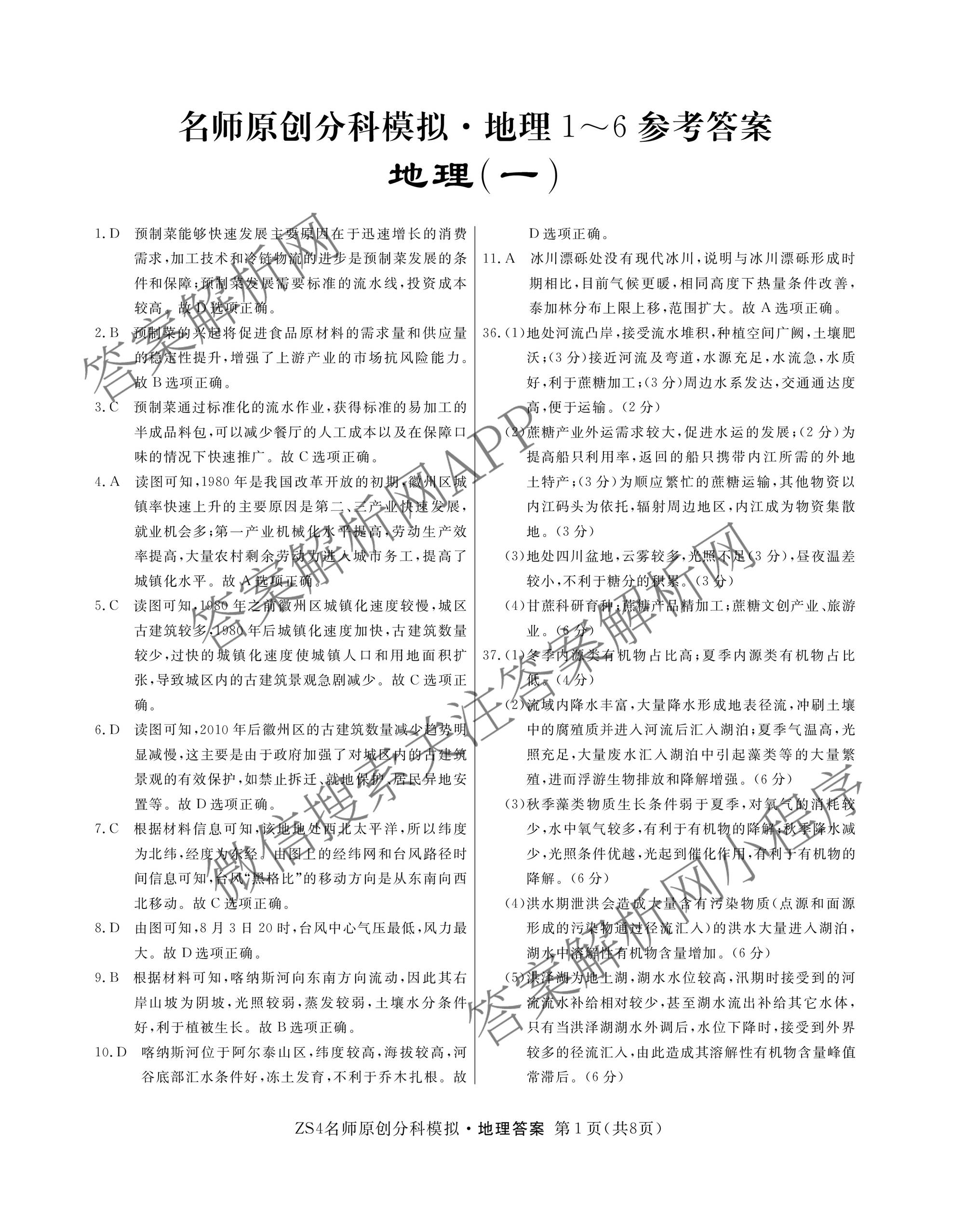 (高三)2024届总复习名师原创分科模拟 地理(ZS4)(一)1答案