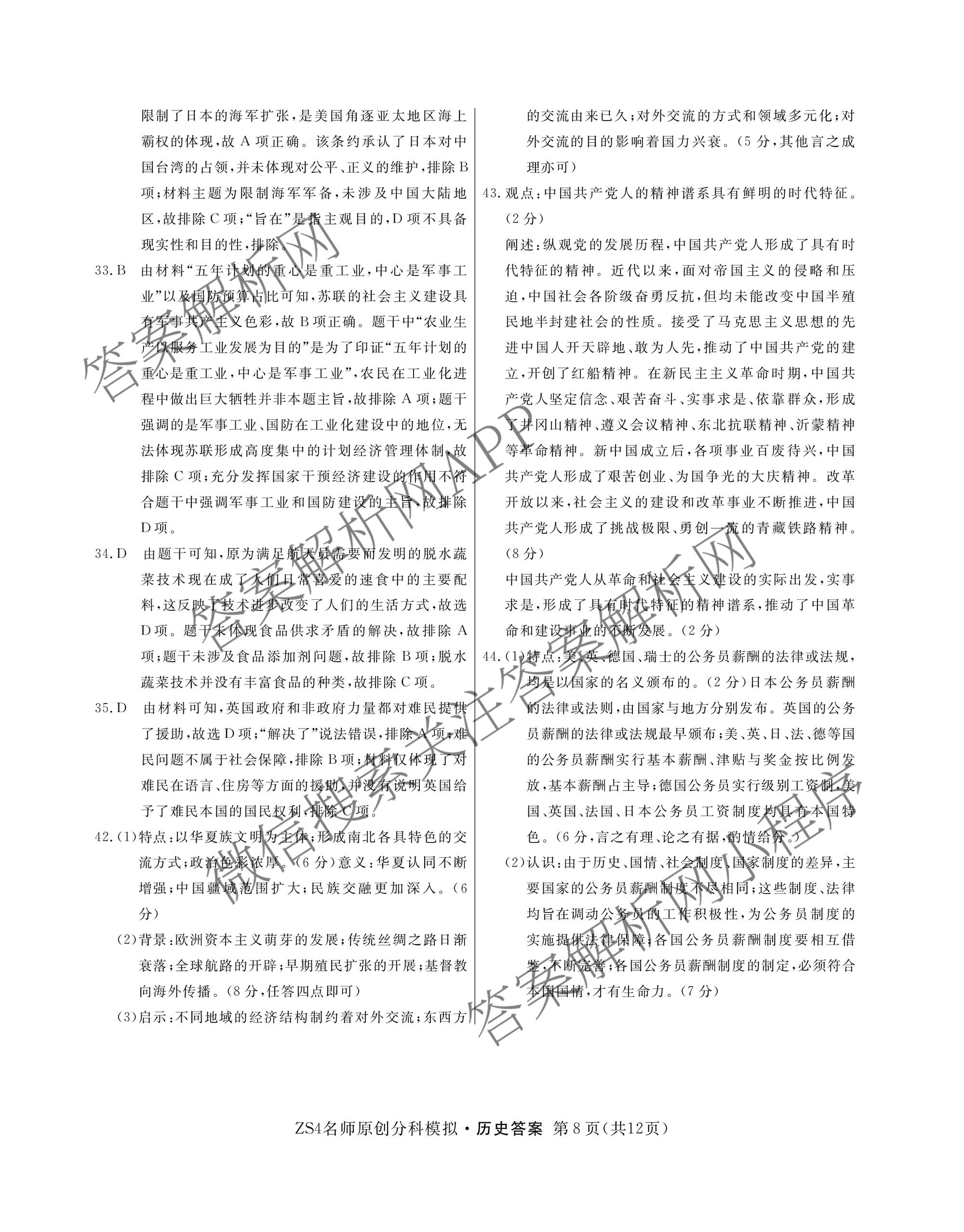 [高三]2024届总复习·名师原创分科模拟 历史(ZS4)(四)4答案