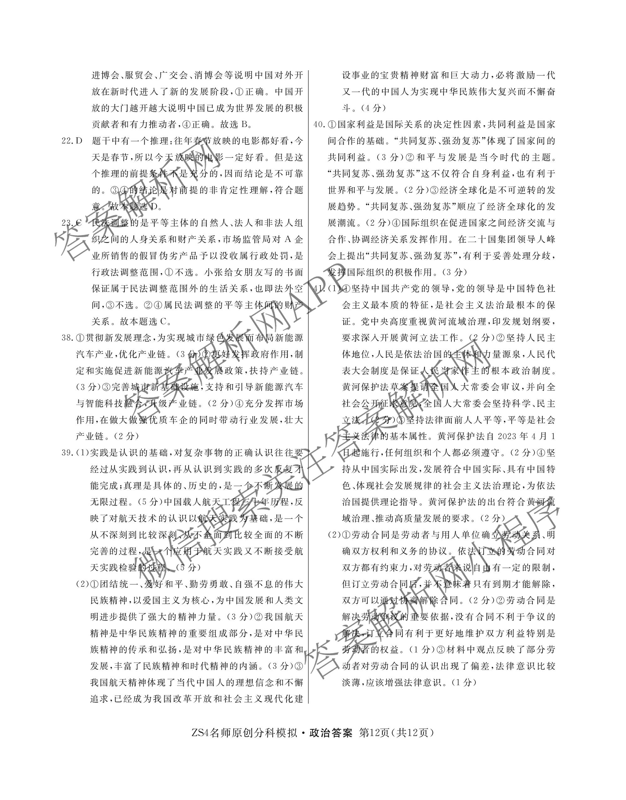 - 2024届[高三]总复习名师原创分科模拟 政治(ZS4)(六)6答案