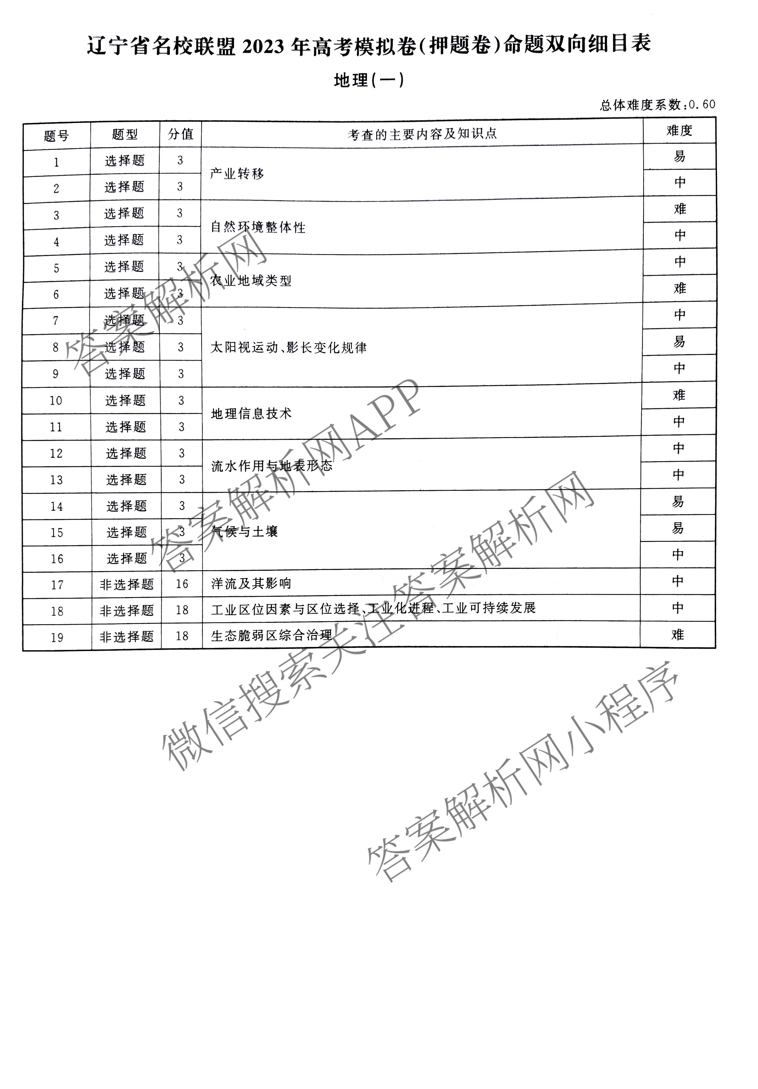 衡水名师卷 2023届高三 辽宁名校联盟押题卷 地理(一)1答案