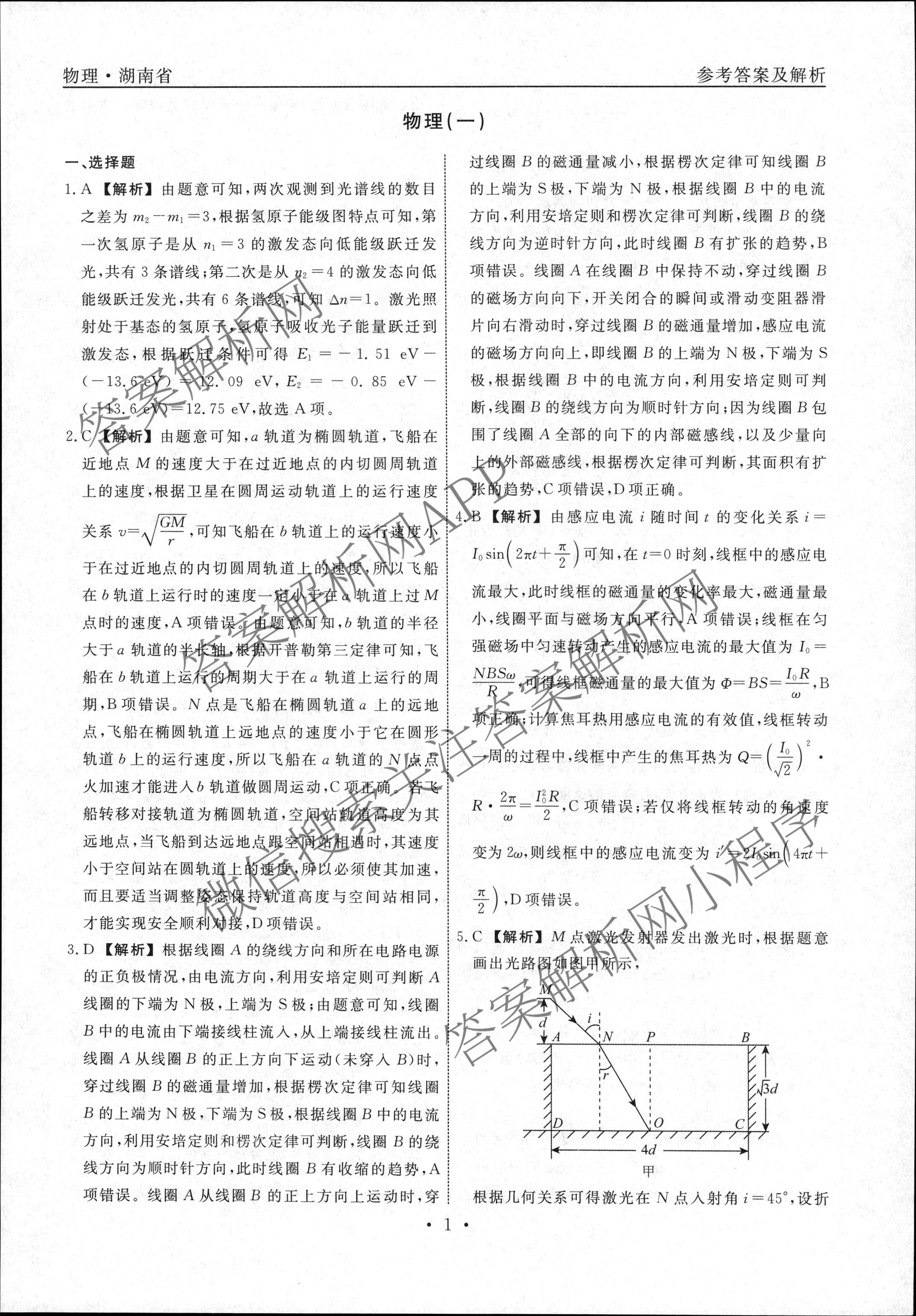 2022~2023(衡水名师卷)·高考模拟压轴卷 物理(湖南)(一)1答案