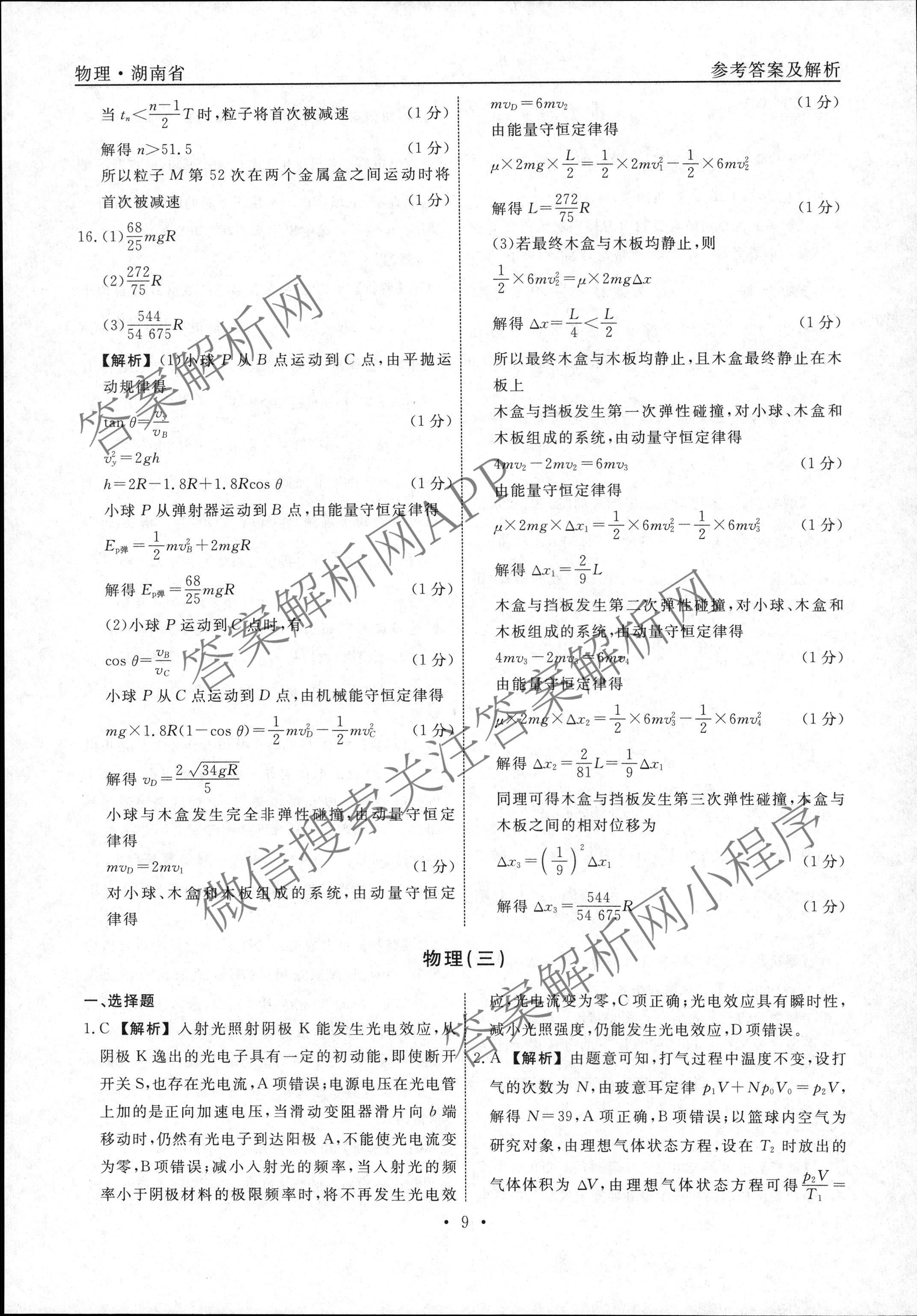 - 2022-2023[高三](衡水名师卷)·高考模拟压轴卷 物理(湖南)(二)2答案
