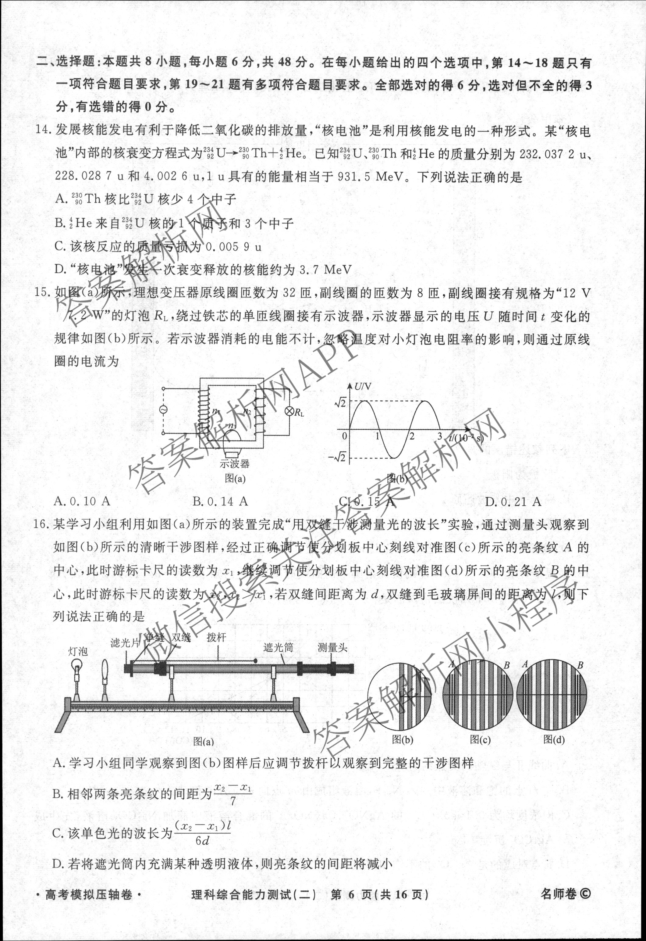 - (衡水名师卷)2022-2023高考模拟压轴卷 理综(老教材)(二)2答案