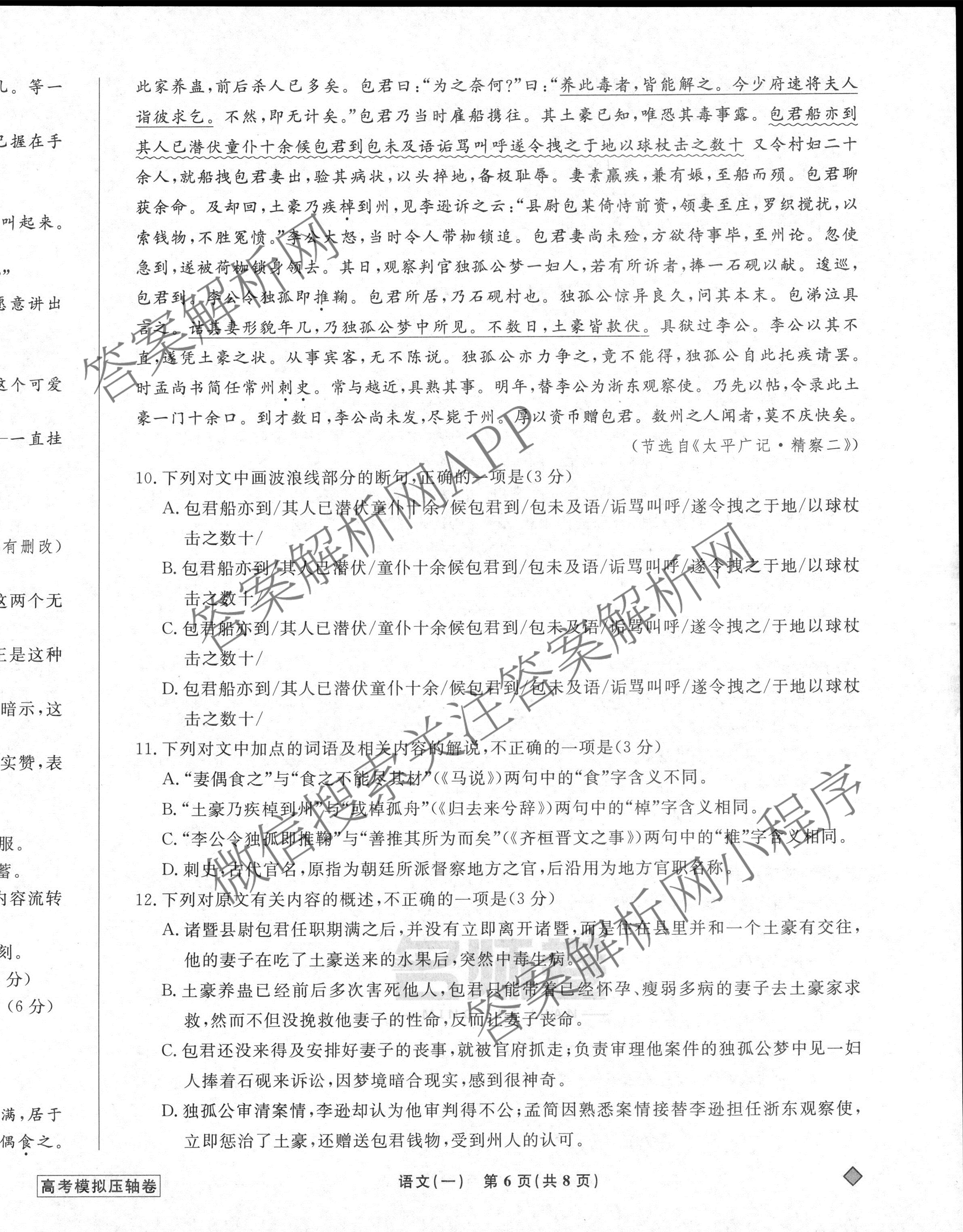- 2022-2023[高三][衡水名师卷]高考模拟压轴卷 语文(老高考)(一)1答案