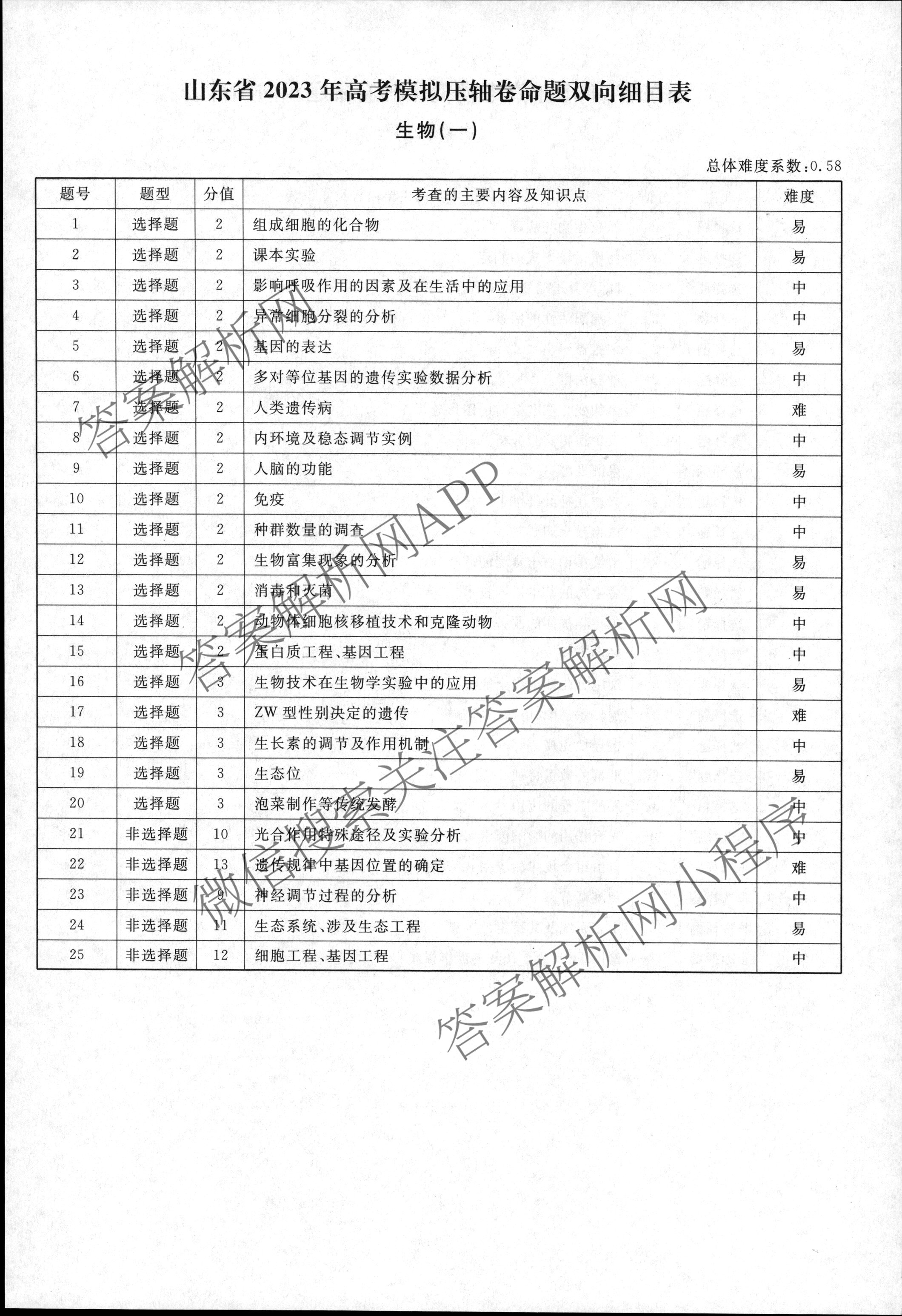 - 2022~2023(高三)衡水名师卷高考模拟压轴卷 生物(山东)(一)1答案