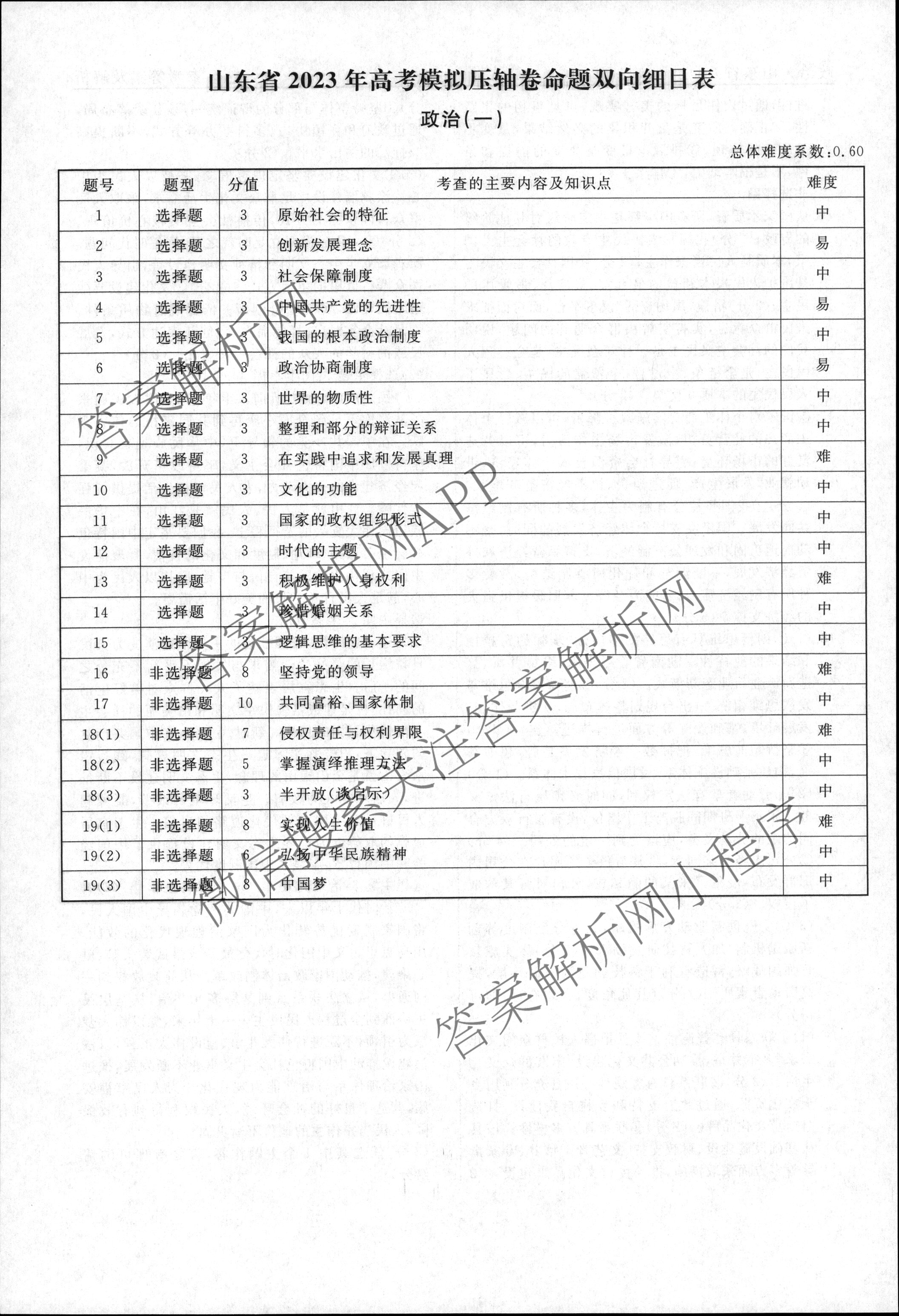 2022~2023[衡水名师卷]·高考模拟压轴卷 政治(山东)(一)1答案