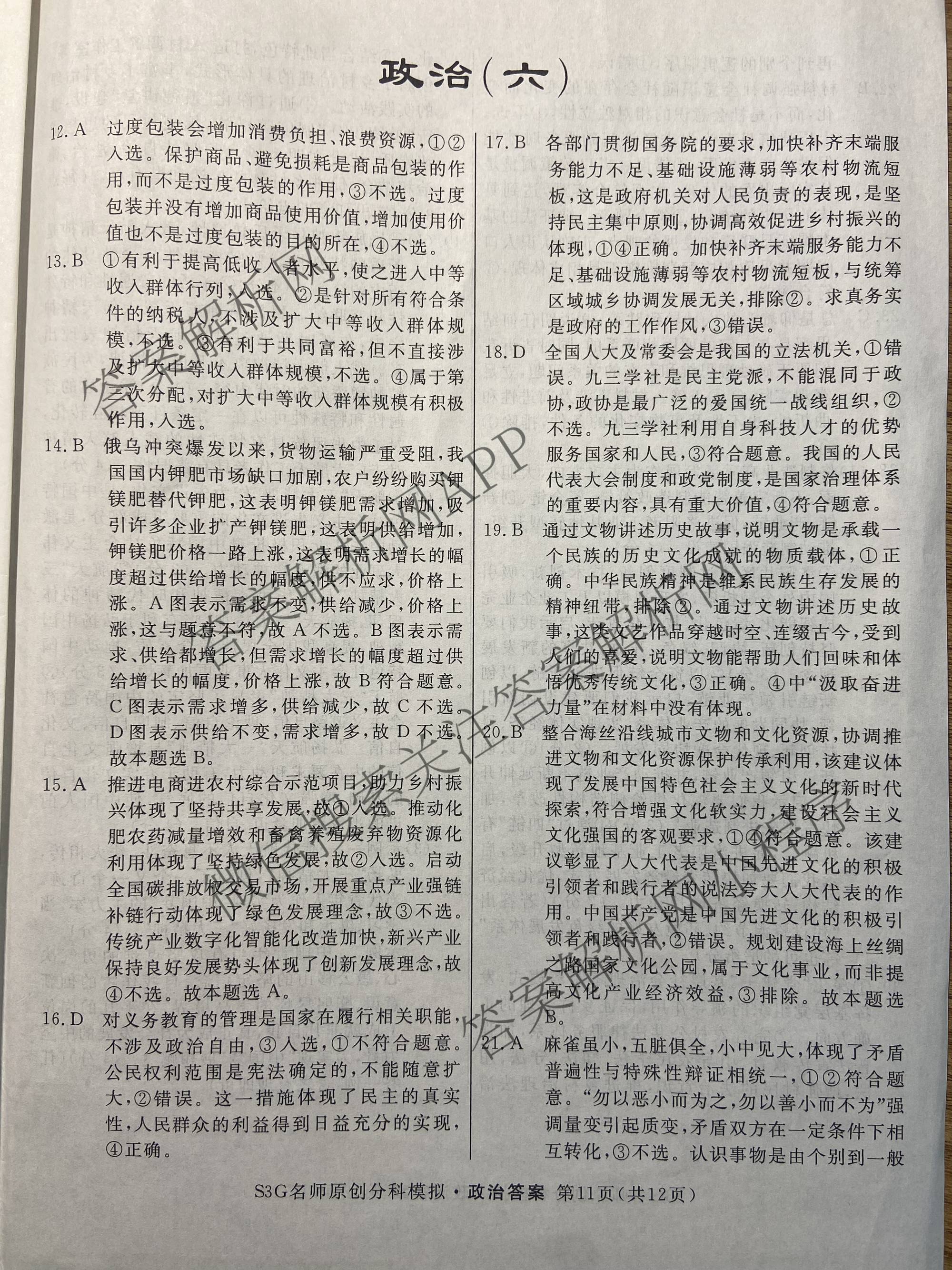 2023届(高三)总复习名师原创分科模拟 政治(S3G)(六)6答案