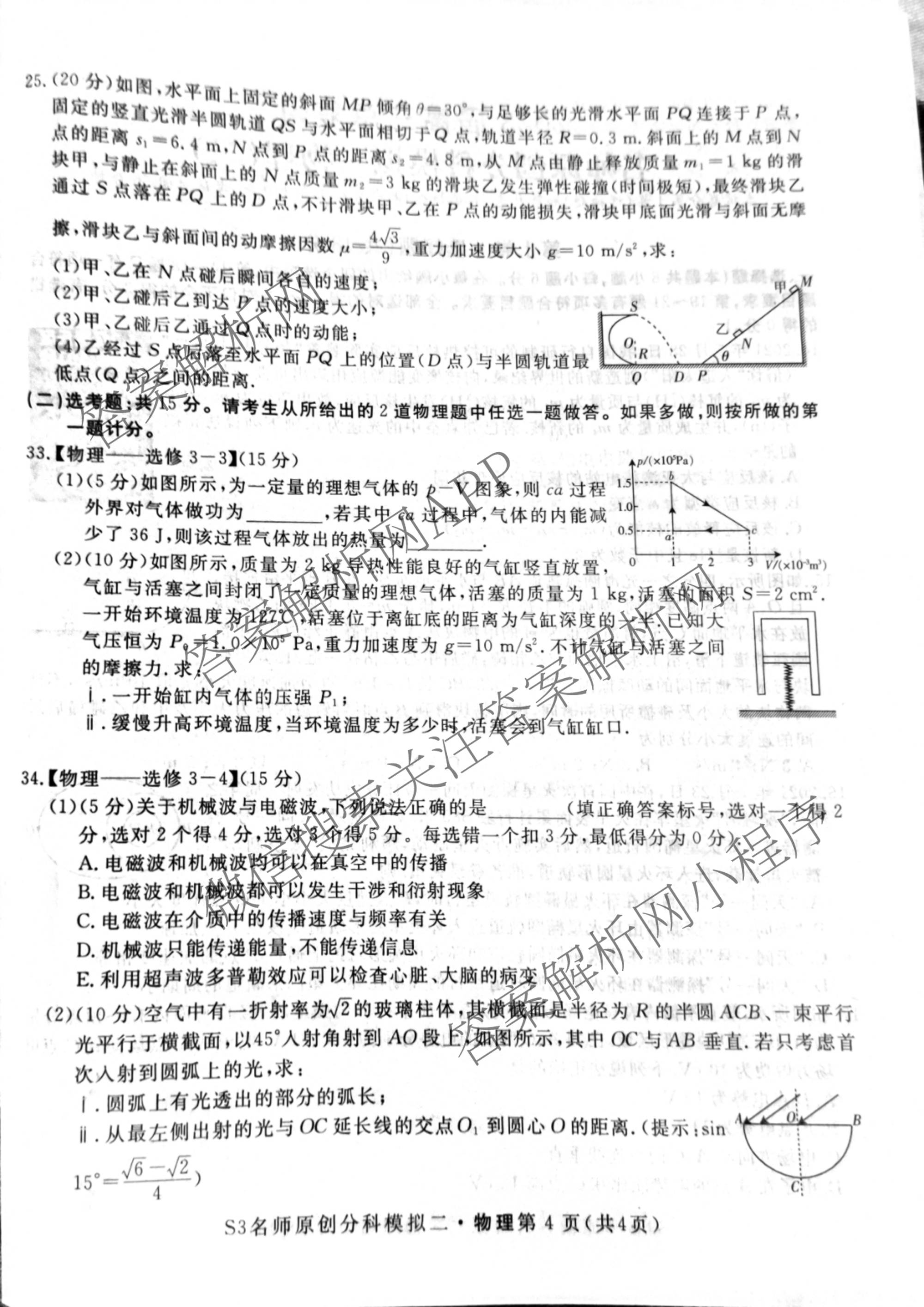 - 2023届(高三)总复习S3名师原创模拟物理(二)2答案