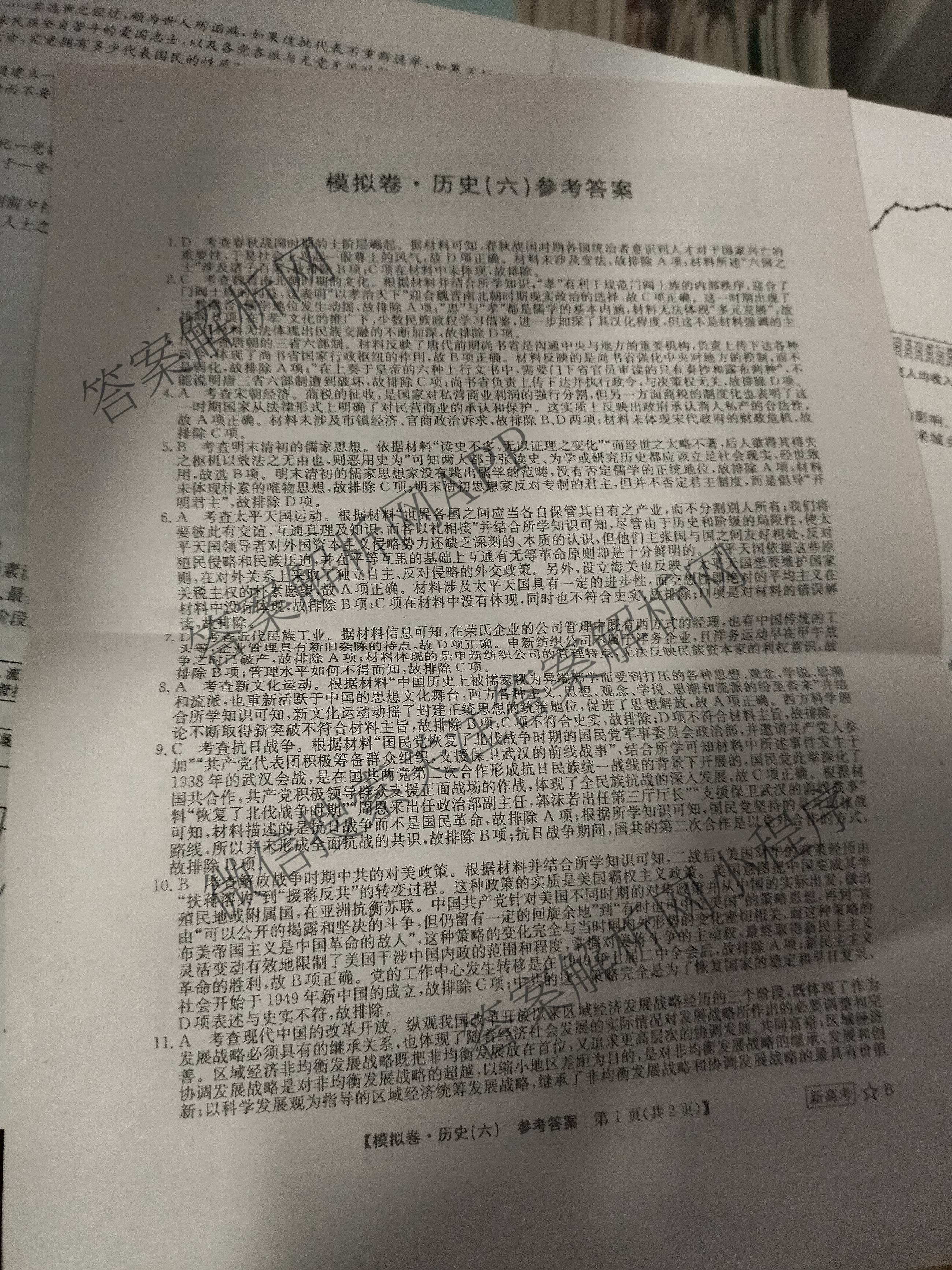 2023届全国新高考分科综合模拟测试卷 历史 新高考☆B(六)6答案