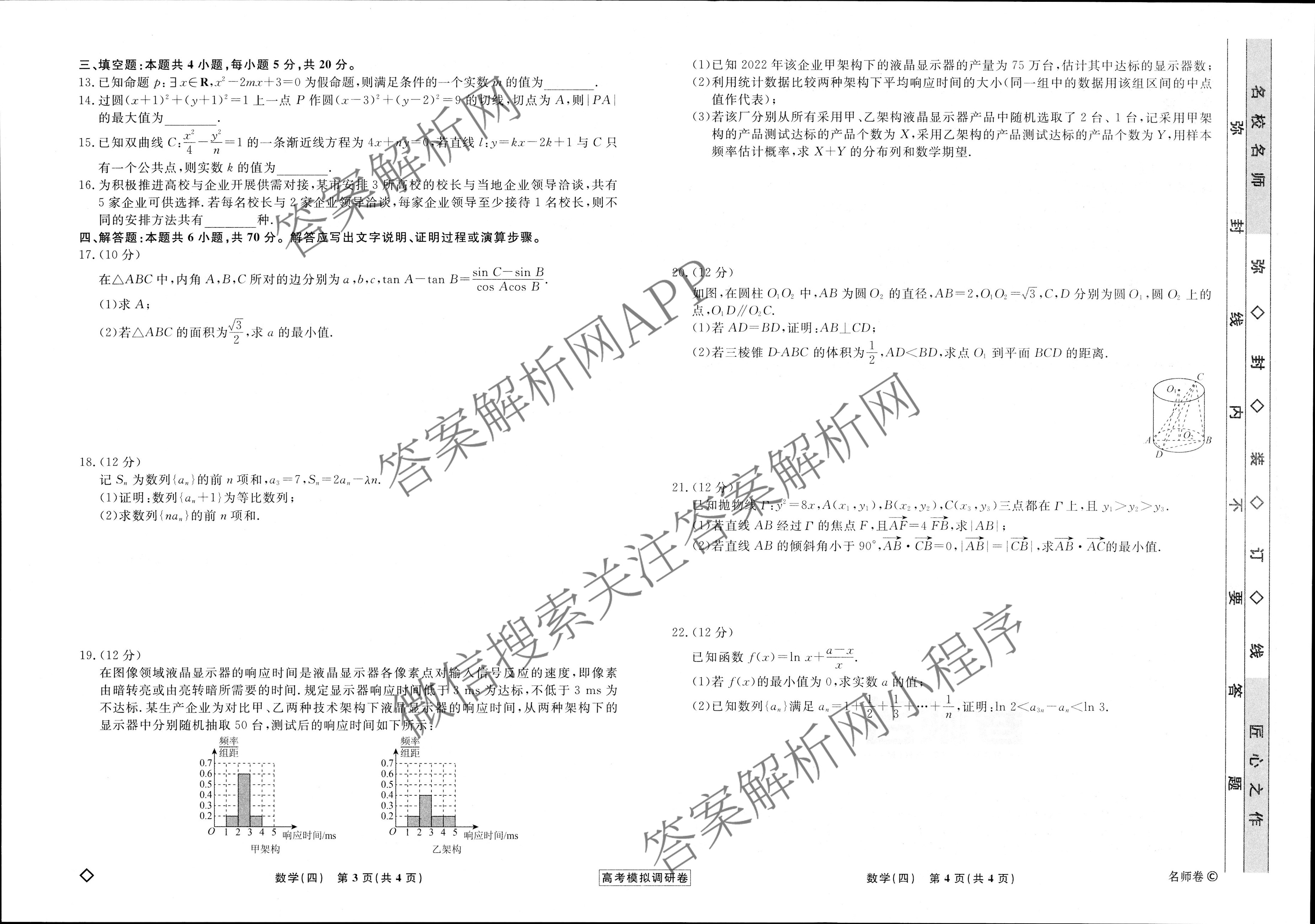 - 2022~2023高三衡水名师卷高考模拟调研卷 数学(空心◇)(四)4答案