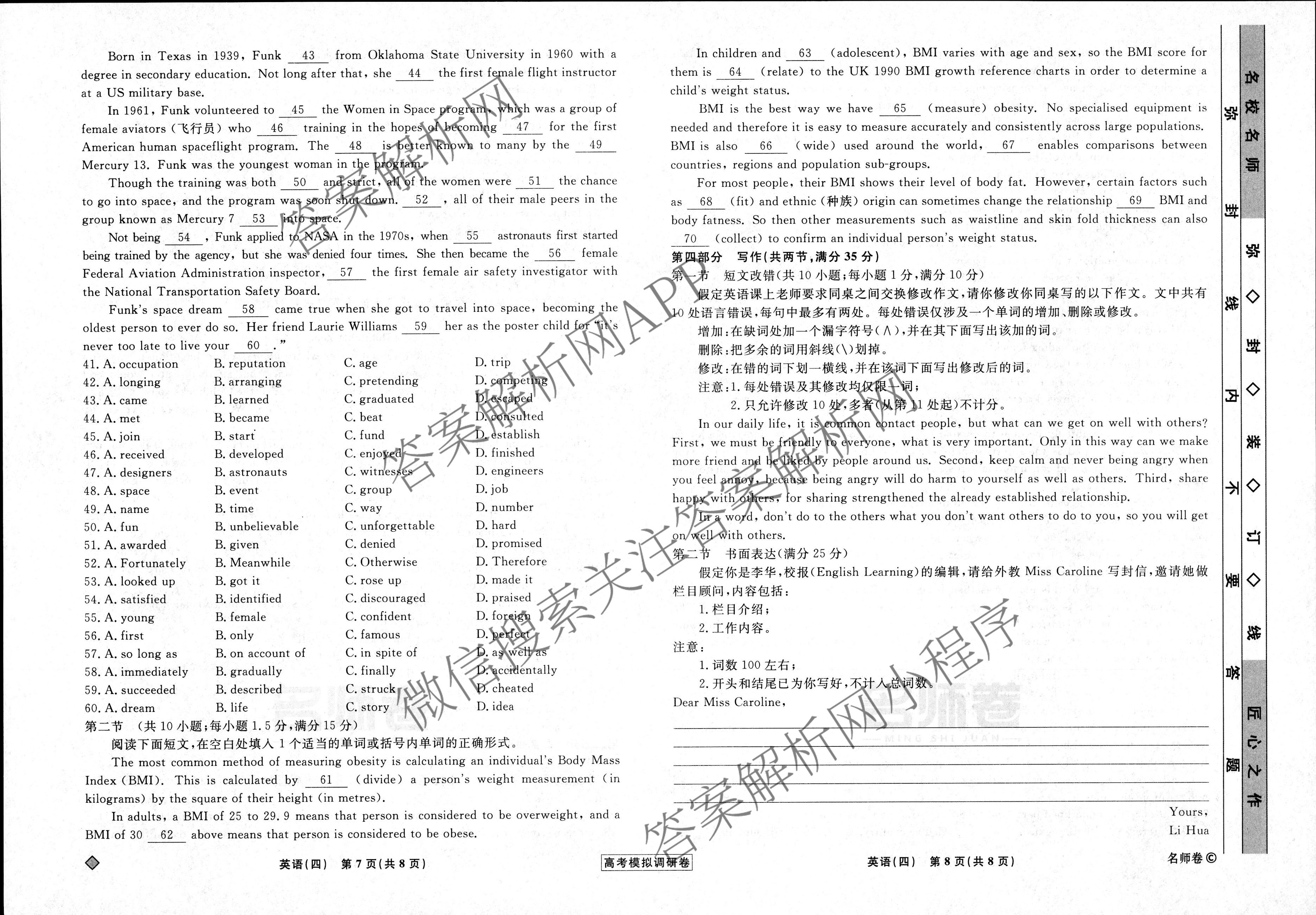 - (高三)[衡水名师卷]2022-2023高考模拟调研卷 英语(空心◇)(四)4答案