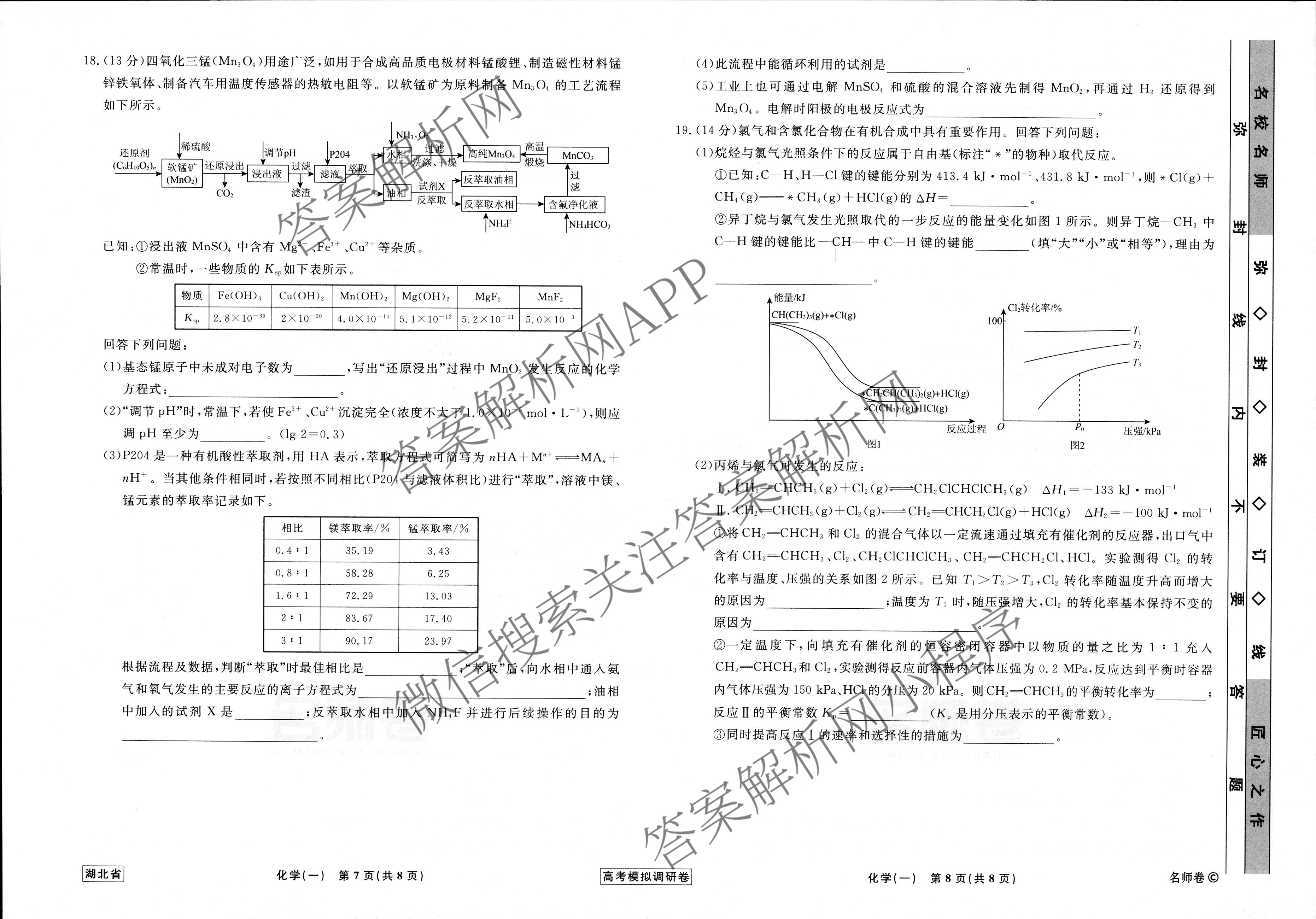 - [高三][衡水名师卷]·湖北省2023年高考模拟调研卷 化学(一)1答案