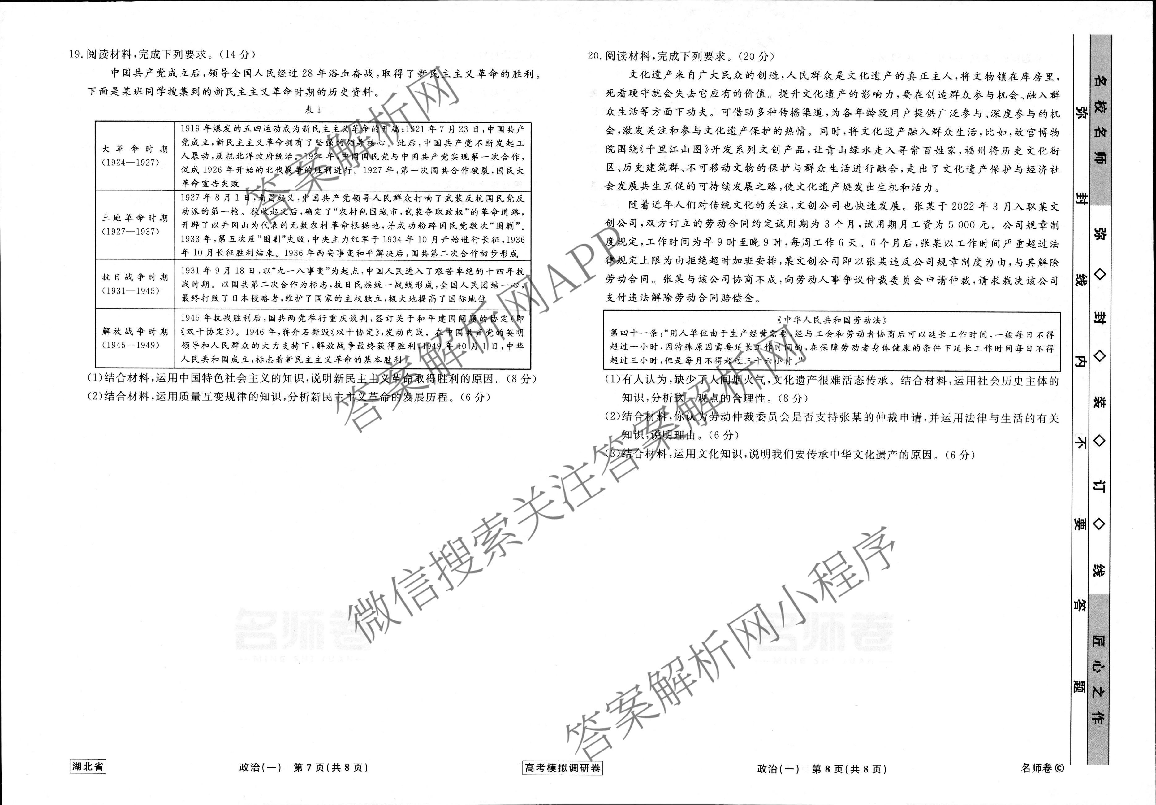 - [高三](衡水名师卷)·湖北省2023年高考模拟调研卷 政治(一)1答案