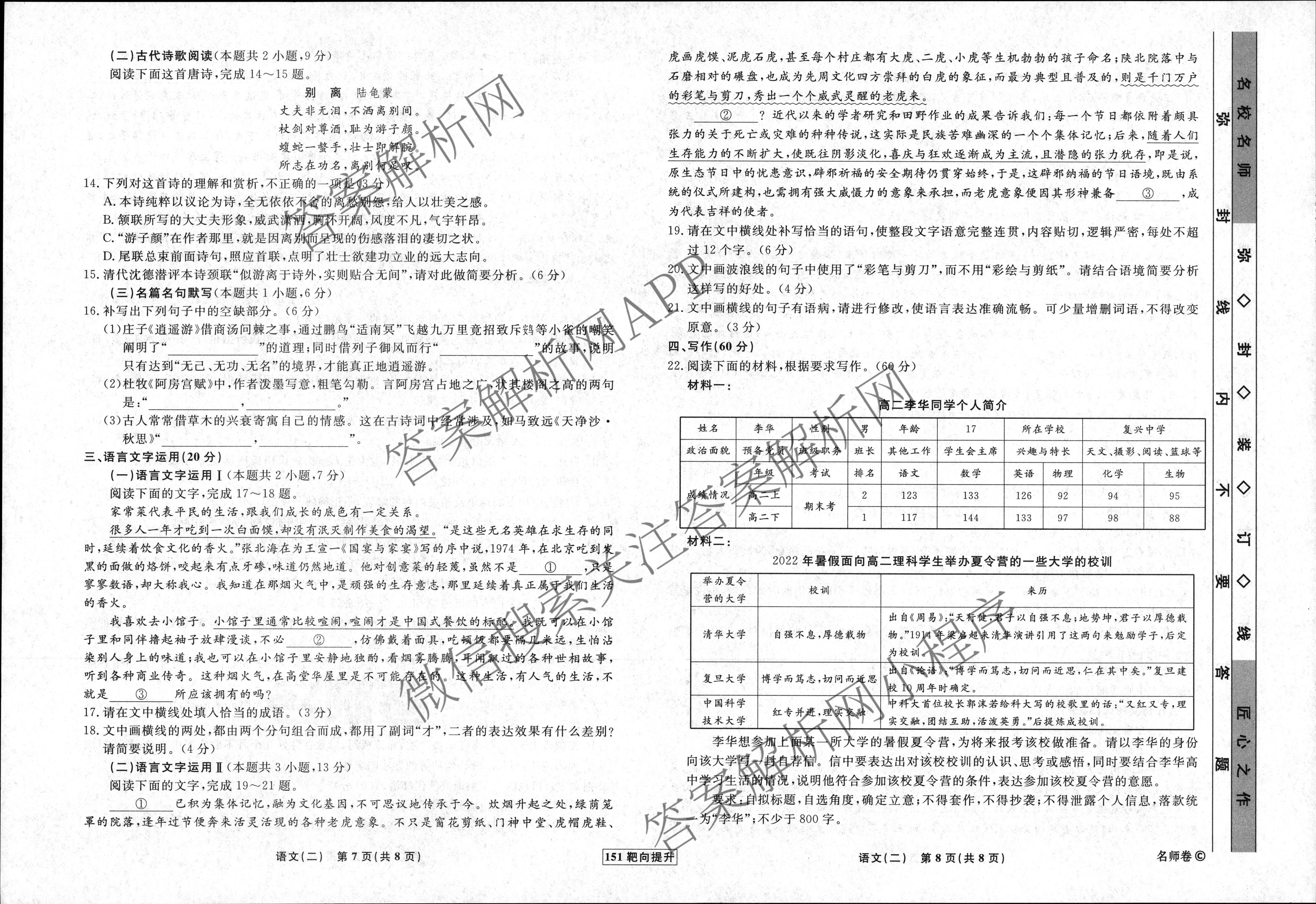 - (衡水名师卷)2022-2023学年度(高三)分科检测提分卷151靶向提升(新教材)语文(二)2答案