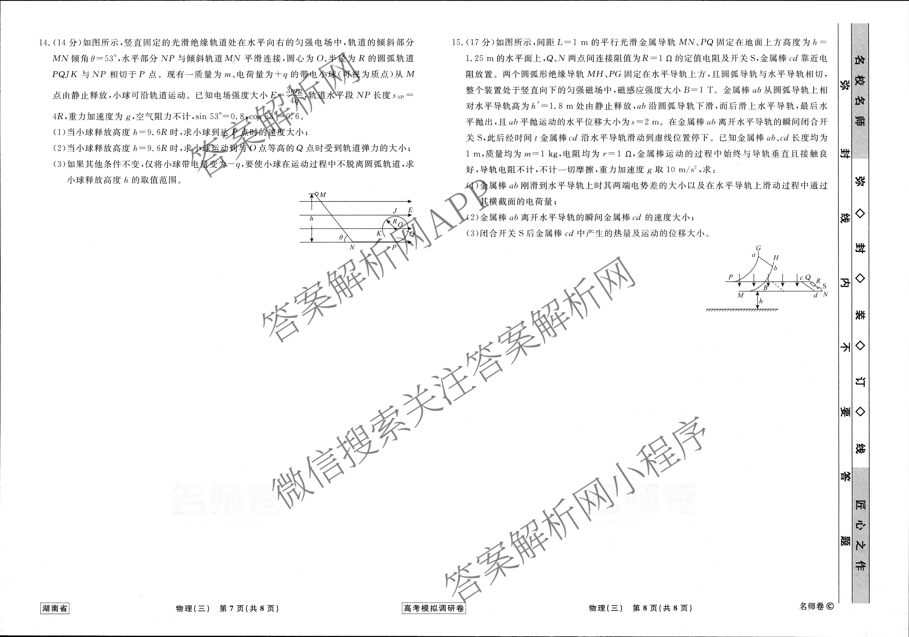 - [高三]衡水名师卷·湖南省2023年高考模拟调研卷 物理(三)3答案