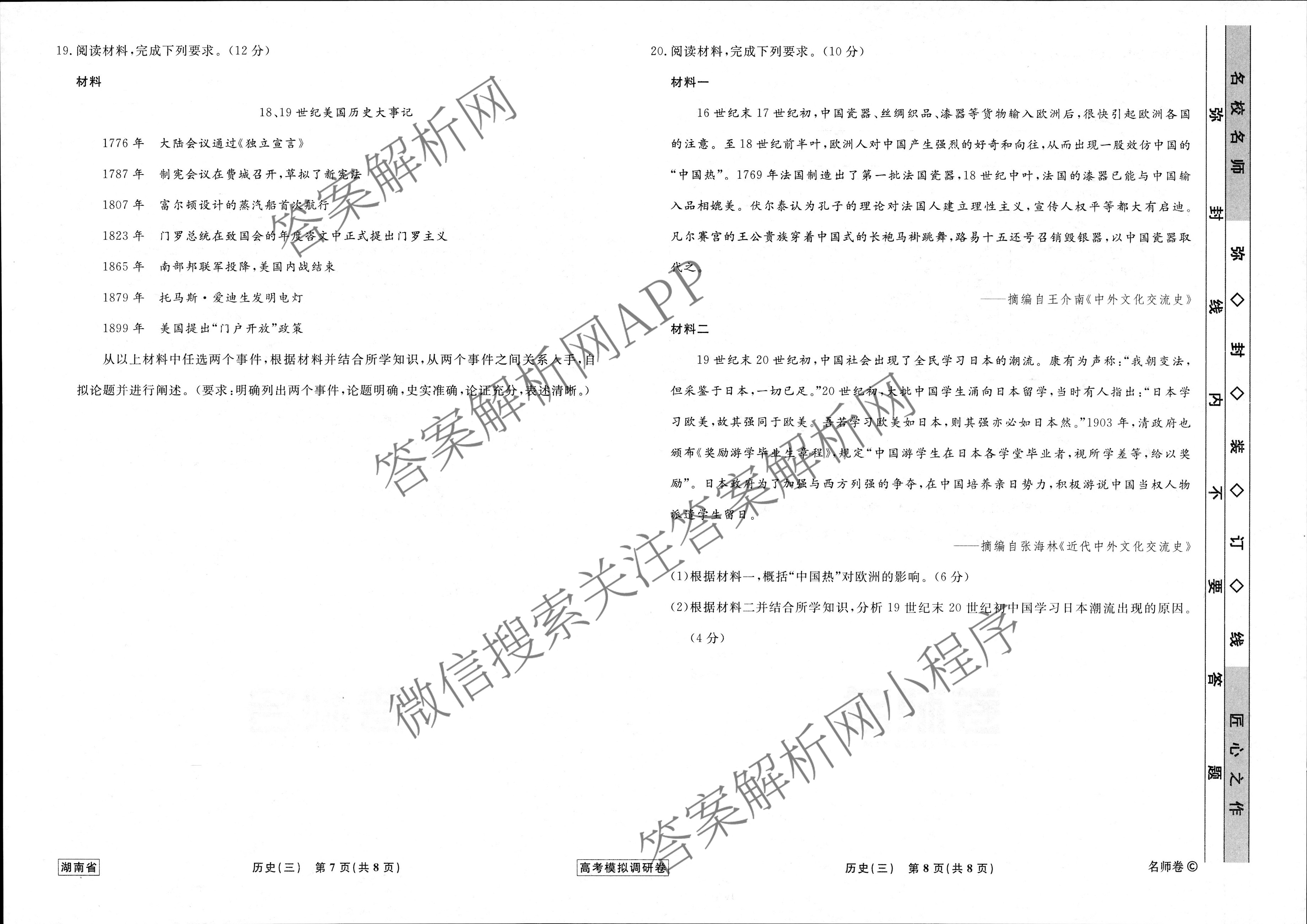 - (高三)(衡水名师卷)湖南省2023年高考模拟调研卷 历史(三)3答案