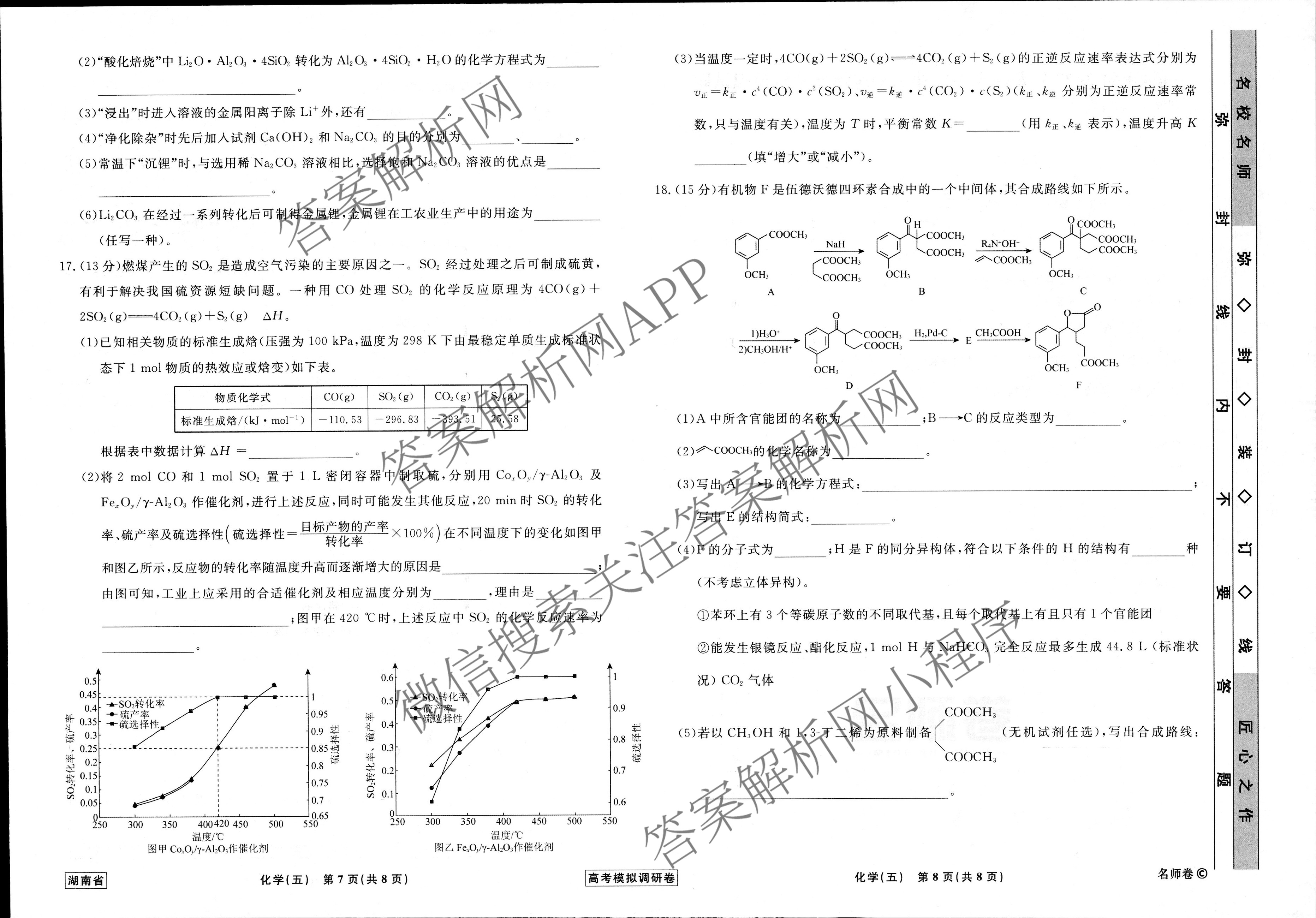 - [衡水名师卷]湖南省2023年高考模拟调研卷 化学(五)5答案