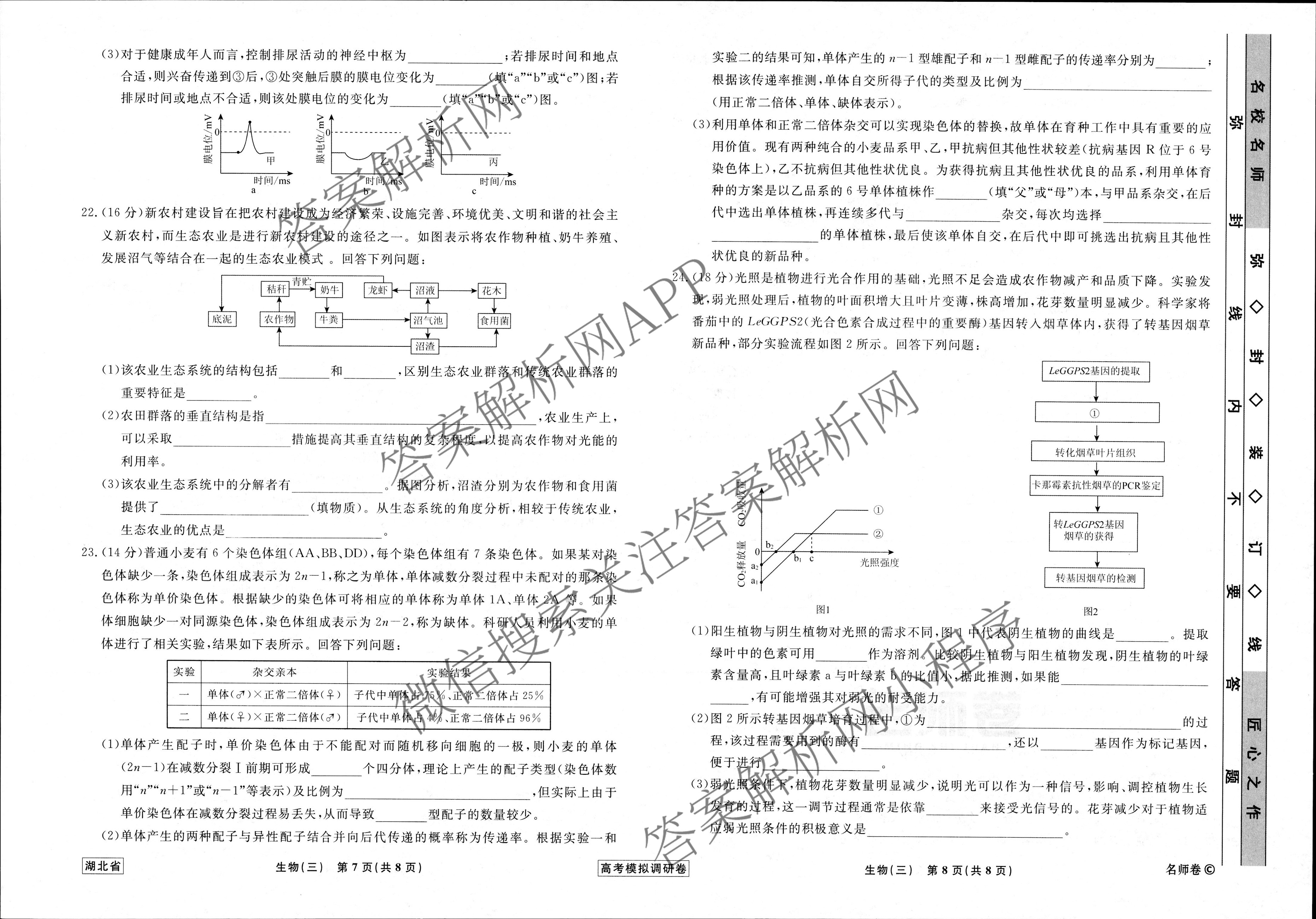 - 高三(衡水名师卷)·湖北省2023年高考模拟调研卷 生物(三)3答案