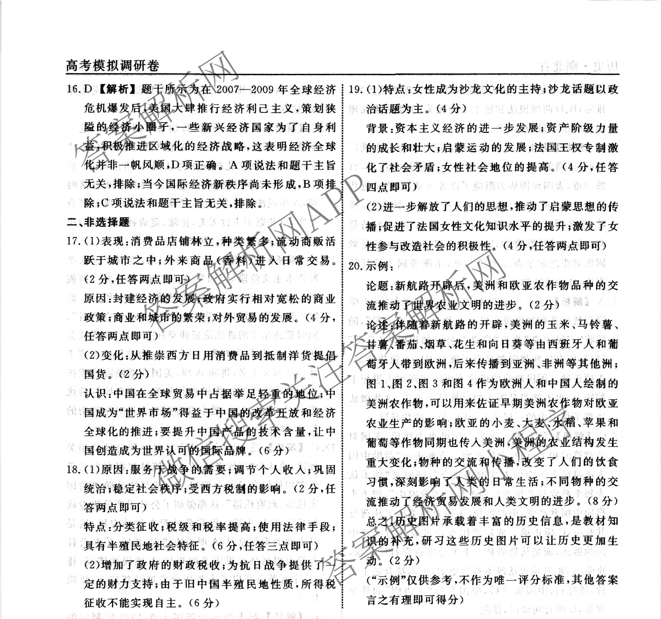 衡水名师卷湖北省2023年高考模拟调研卷 历史(二)2答案