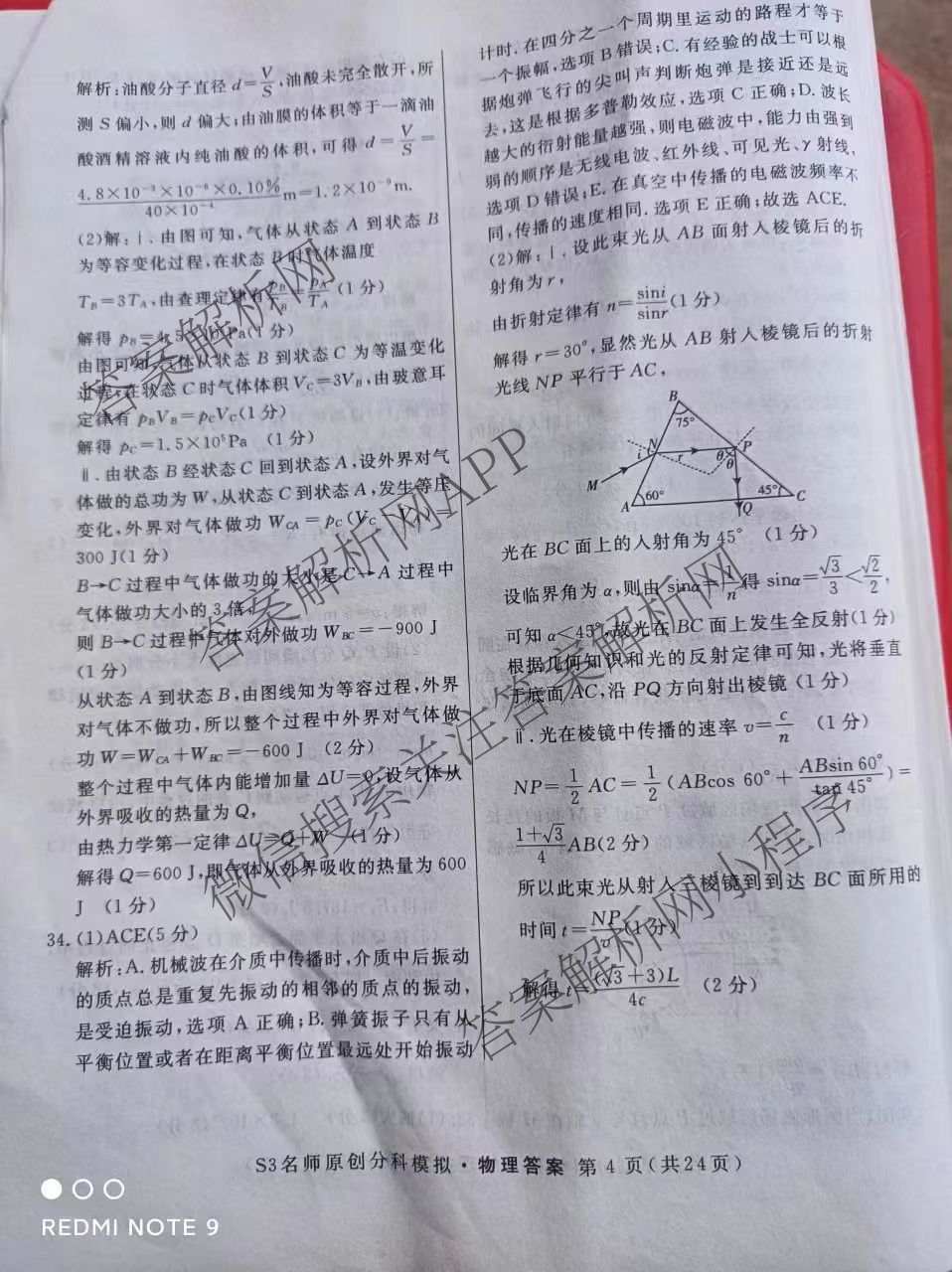 - 2023届(高三)总复习·新S3名师原创模拟物理(一)1答案