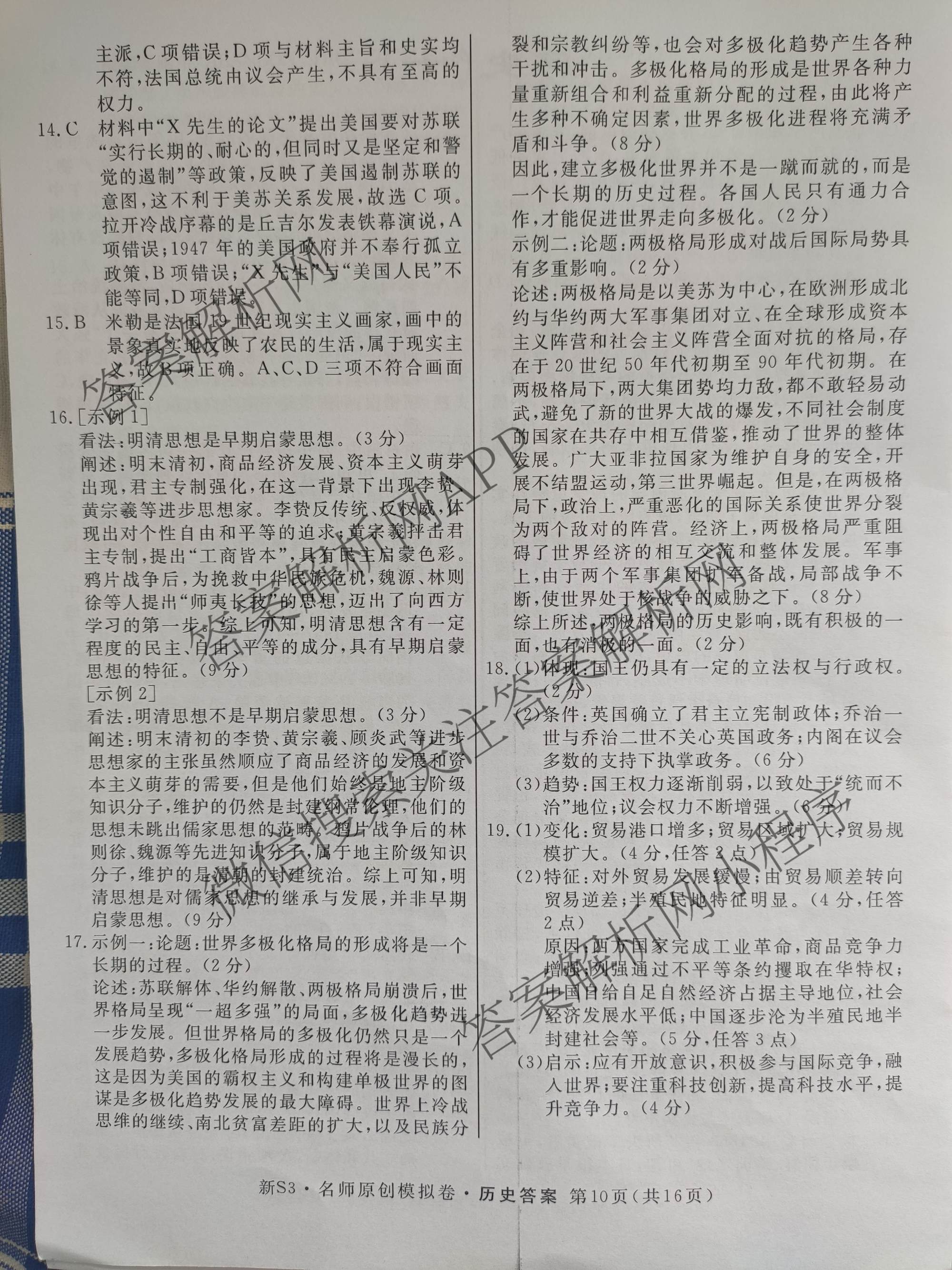 2023届高三总复习S3名师原创模拟 历史(新S3)(十)10答案