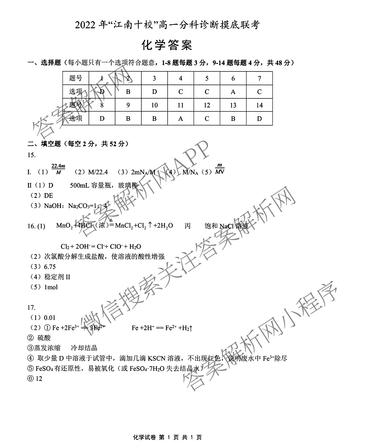 - 2022年[江南十校](高一)分科诊断摸底联考化学答案