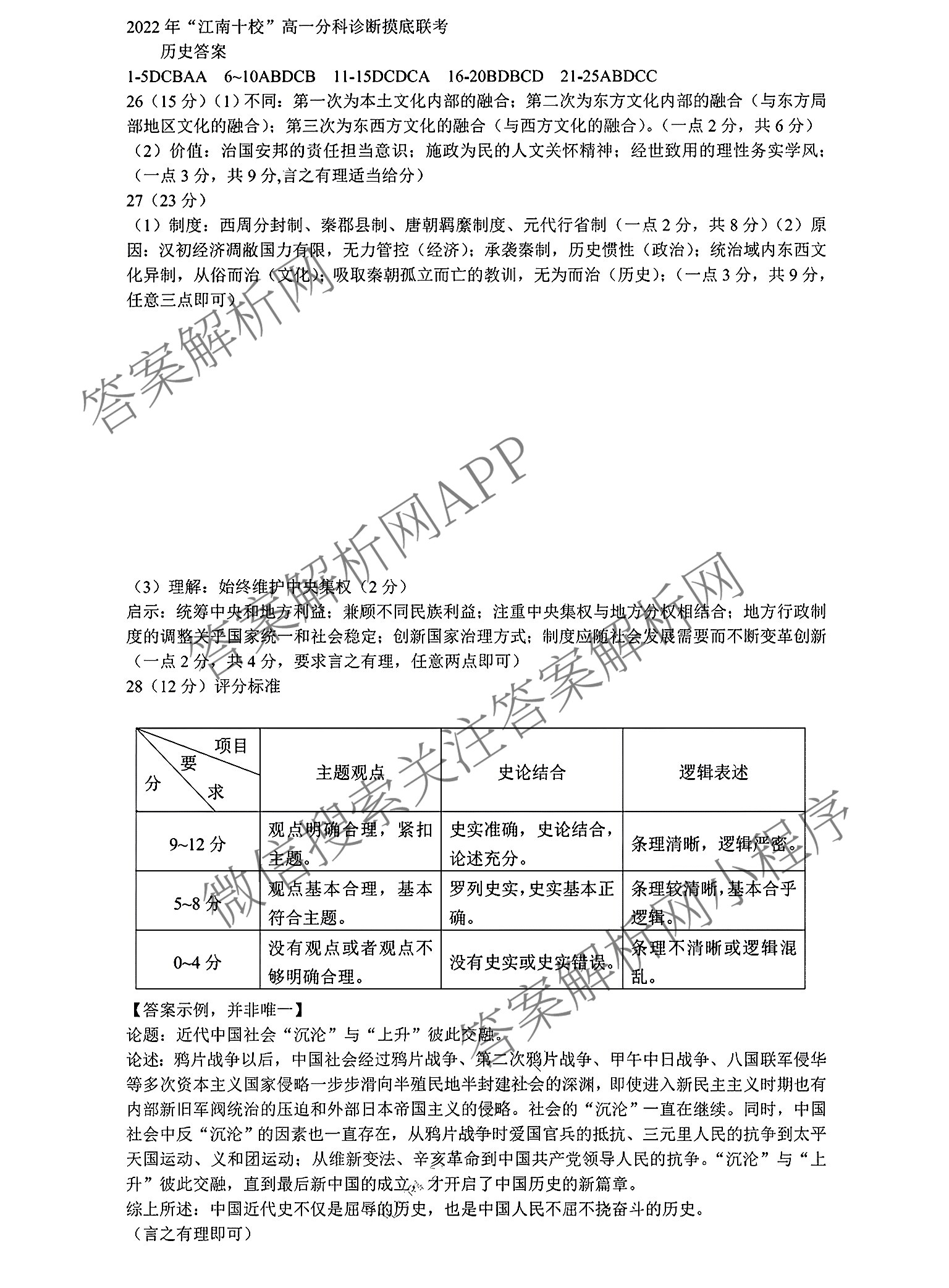高一2022年[江南十校]分科诊断摸底联考历史答案