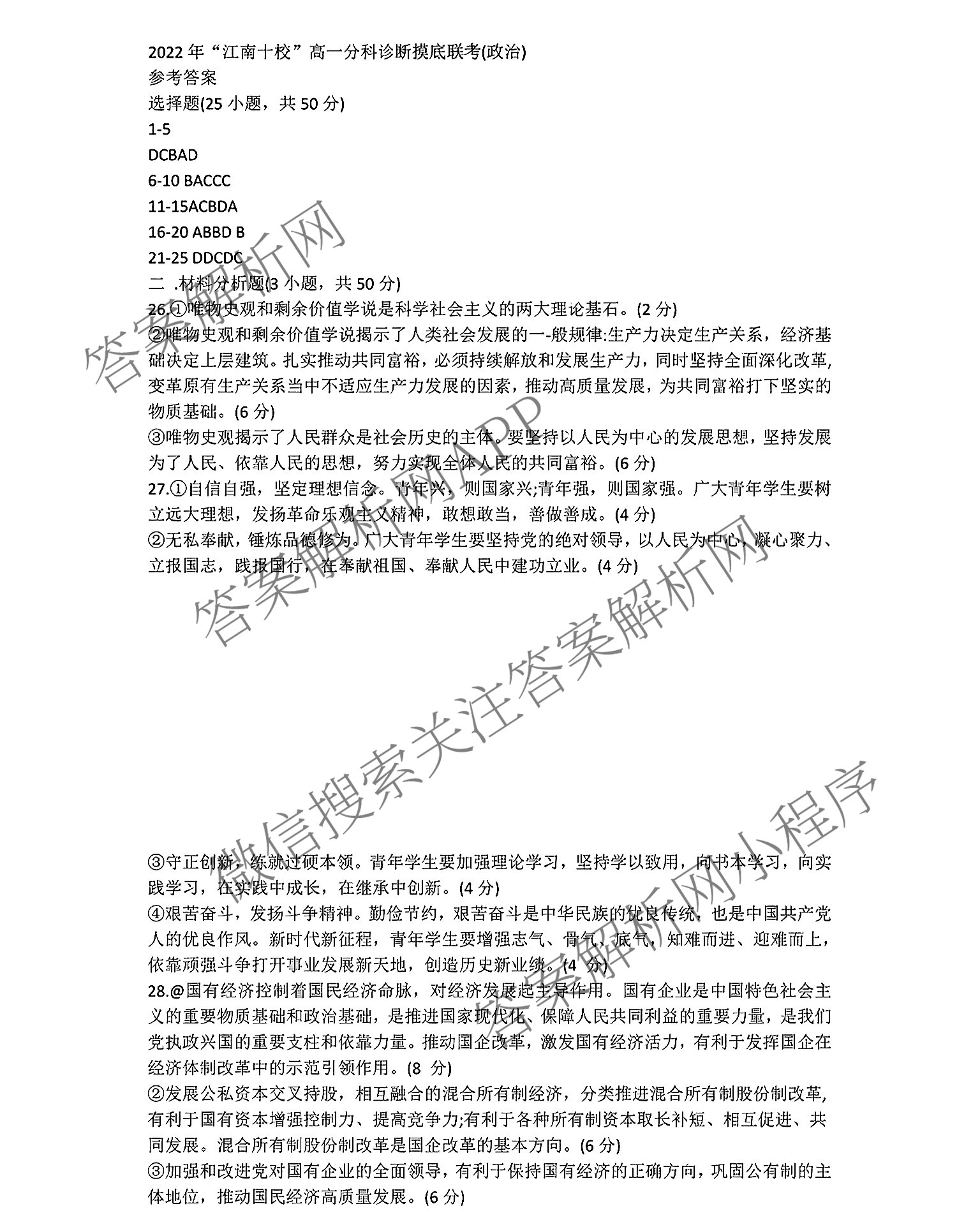 高一2022年(江南十校)分科诊断摸底联考政治答案