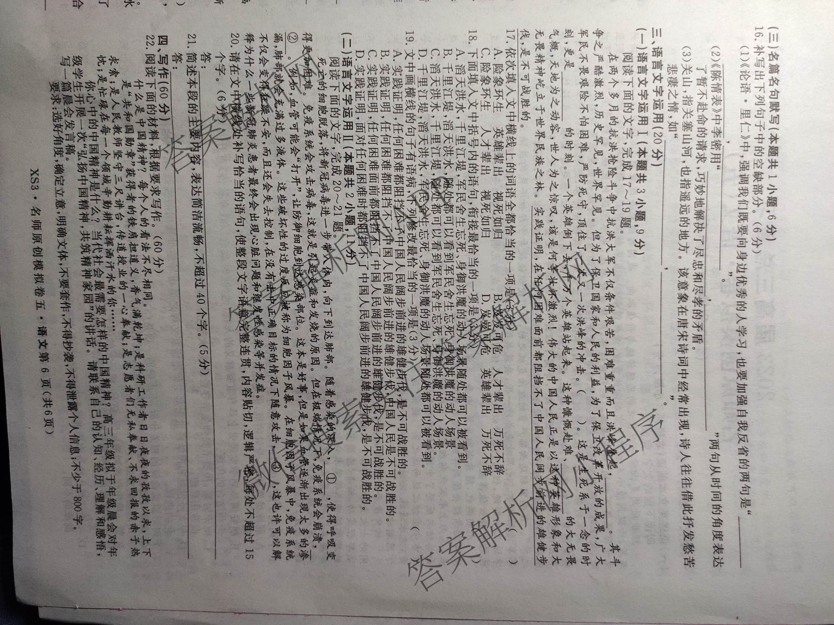 - 2023届[高三]总复习XS3 名师原创模拟语文 (五)5答案