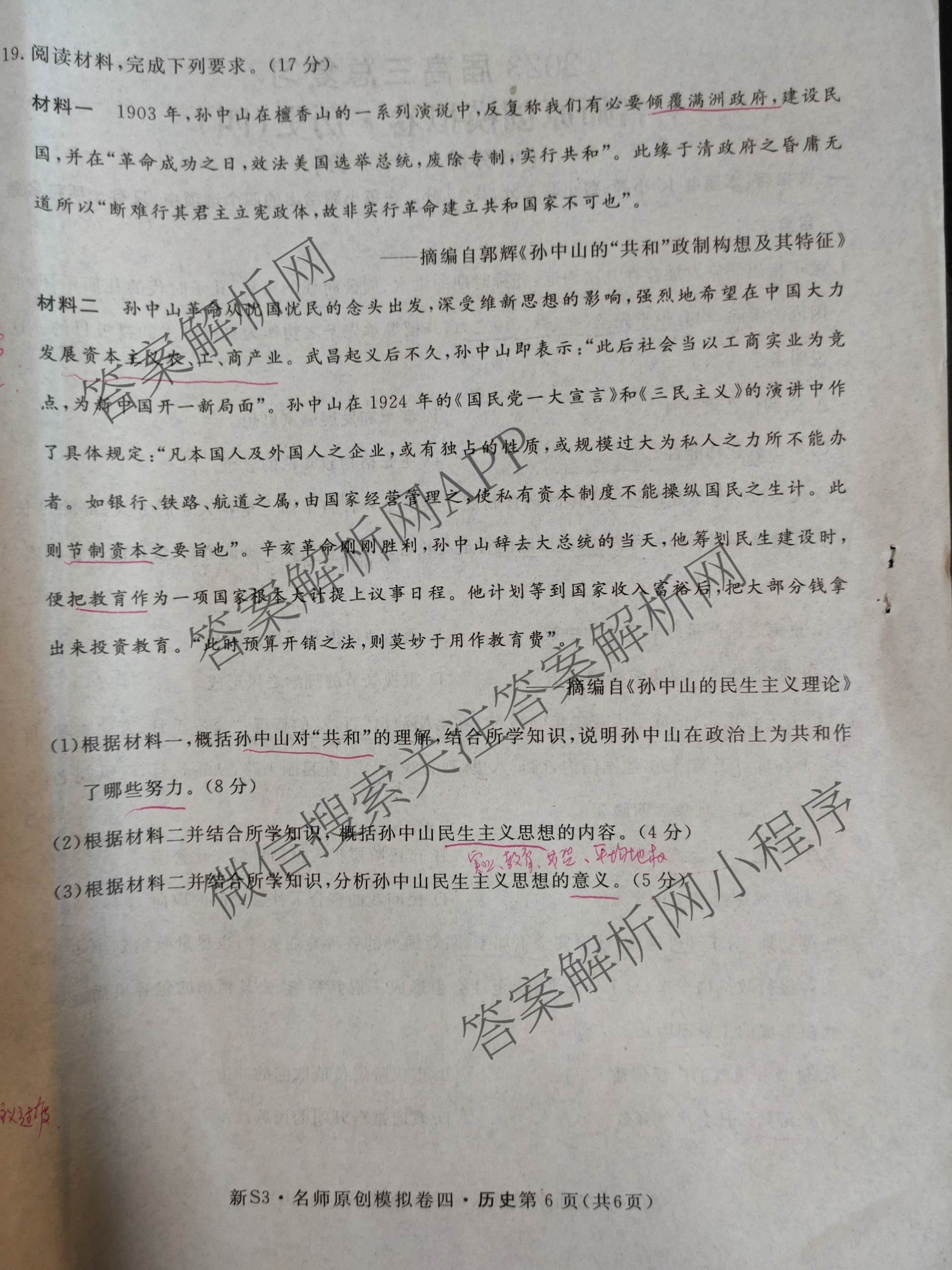 - 2023届[高三]总复习S3名师原创分科模拟政治(四)4答案