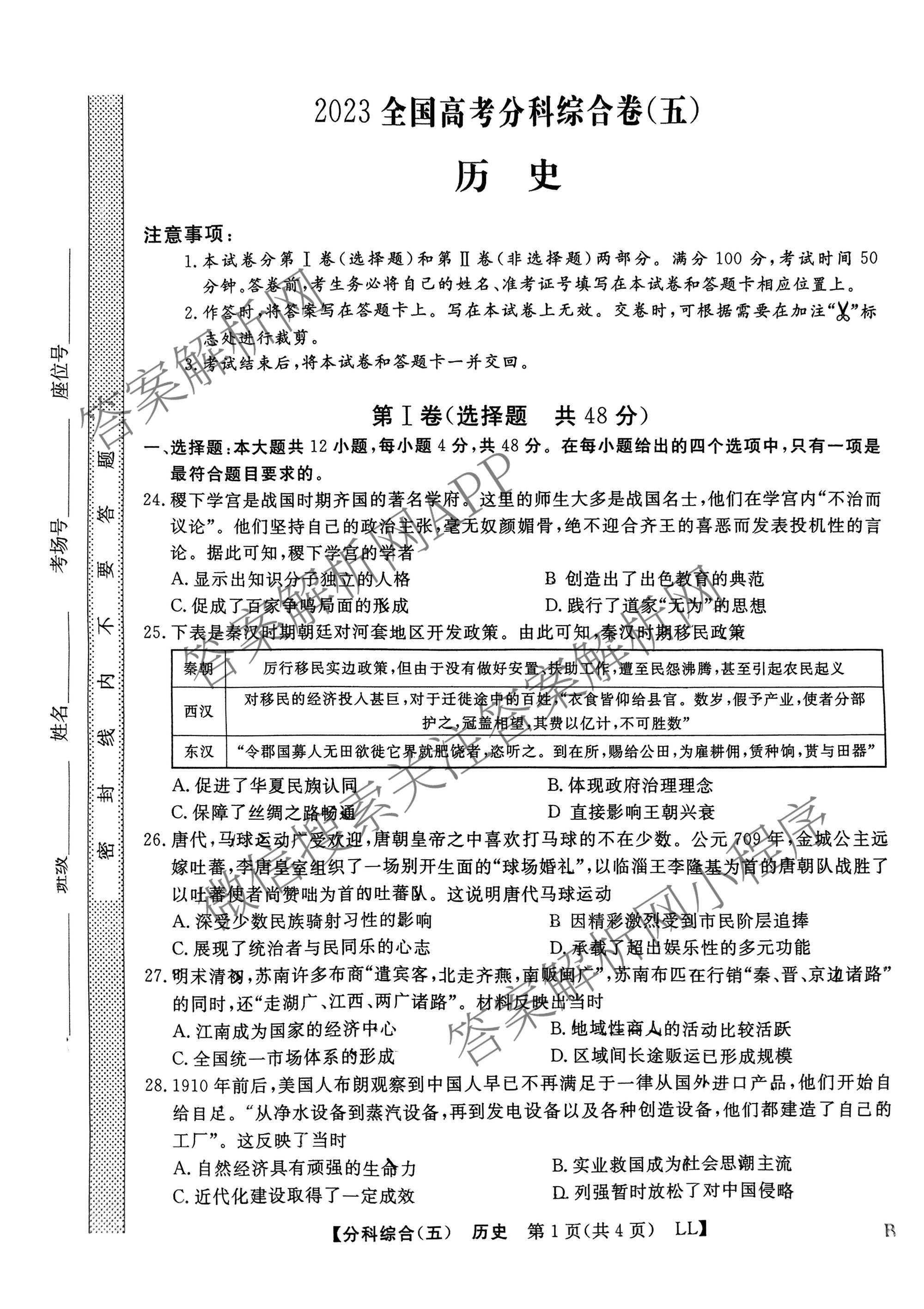 2023[全国高考分科综合卷] 历史 LL B(五)5试题