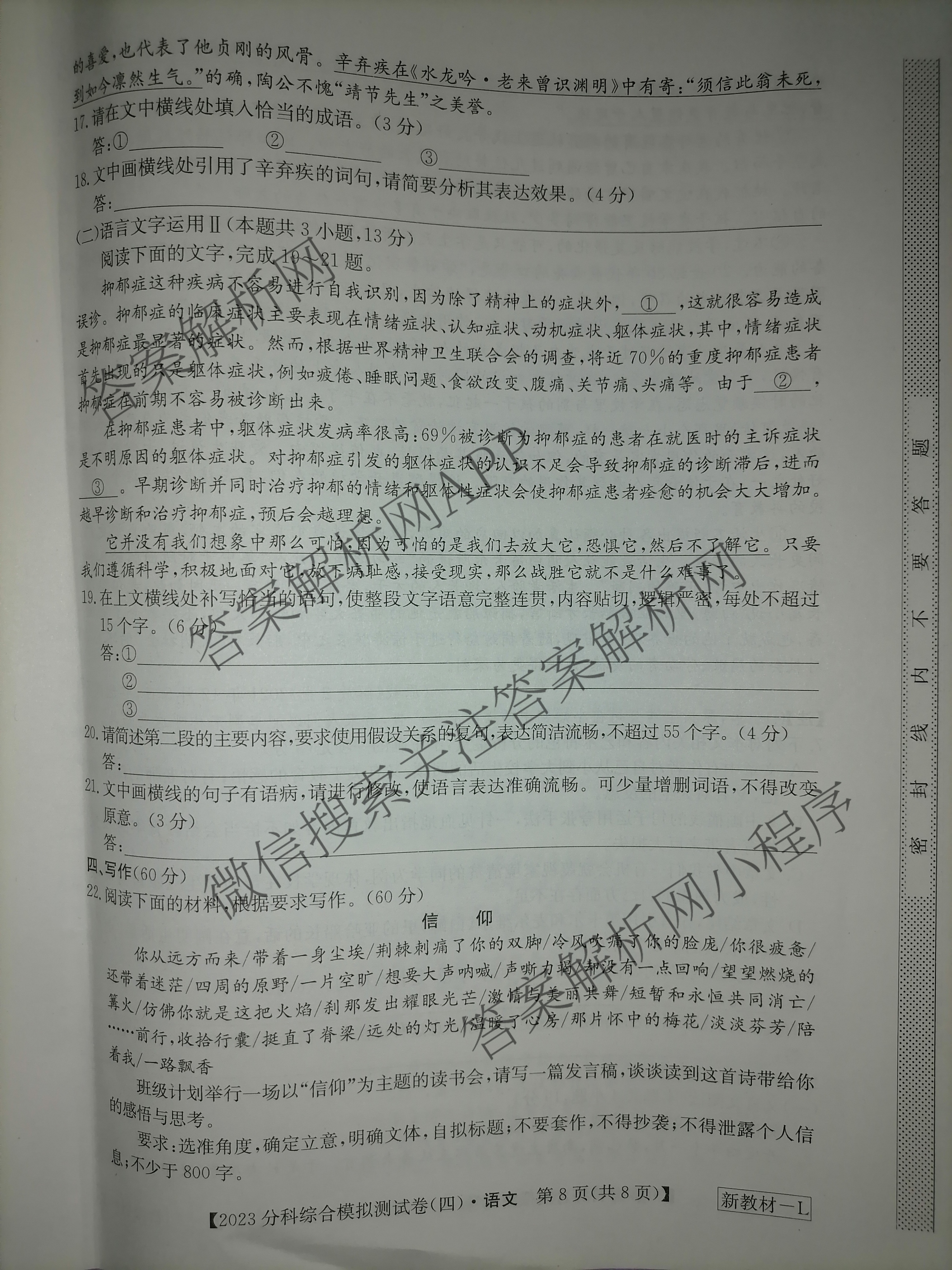 2023届全国高考分科综合模拟测试卷(四)语文 新教材-L试题,目前分科卷答案网已经汇总了2023届全国高考分科综合模拟测试卷(四)语文 新教材-L试题的各科答案和试卷,获取更多全国高考分科综合模拟测试卷答案解析,请在关注本站。