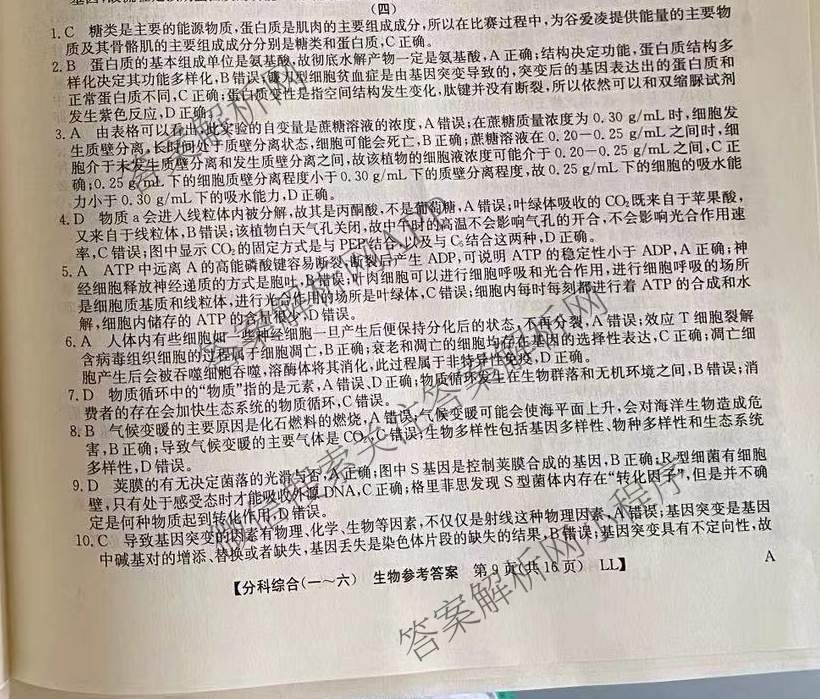 - 高三2023[全国高考分科综合卷] 生物 LL B((四)4答案
