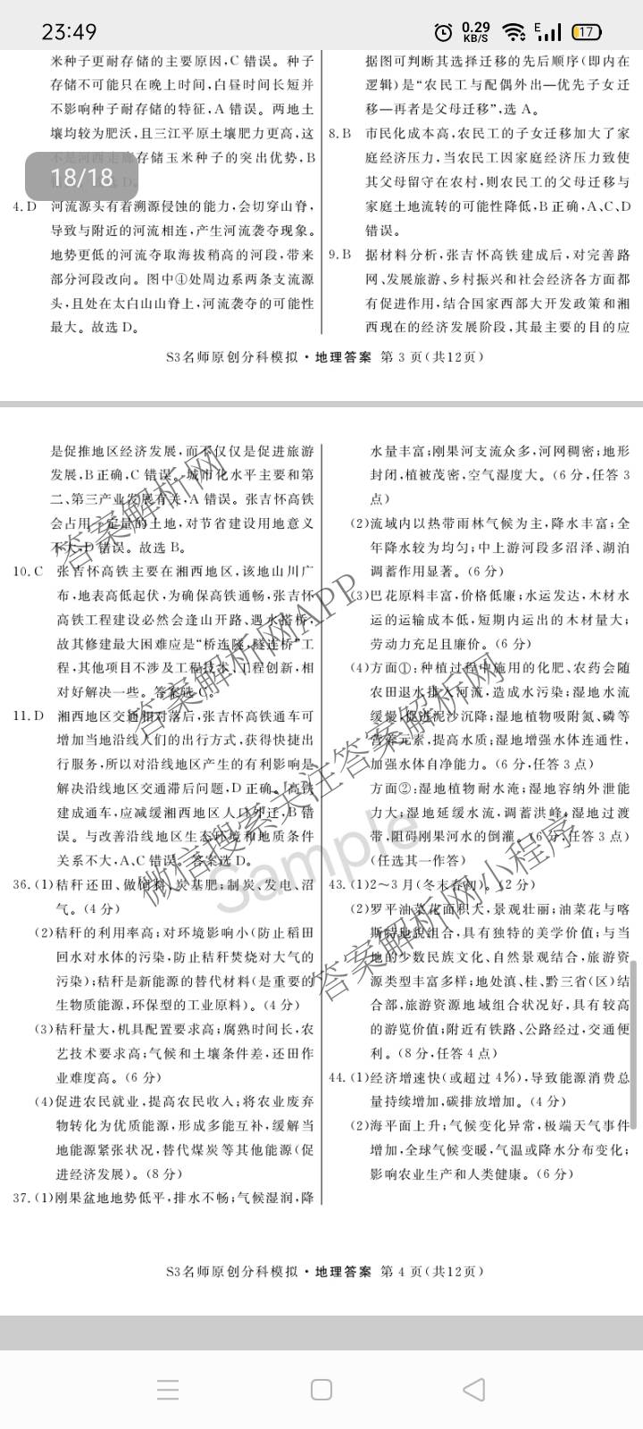 2023届高三总复习S3名师原创模拟地理(二)2答案