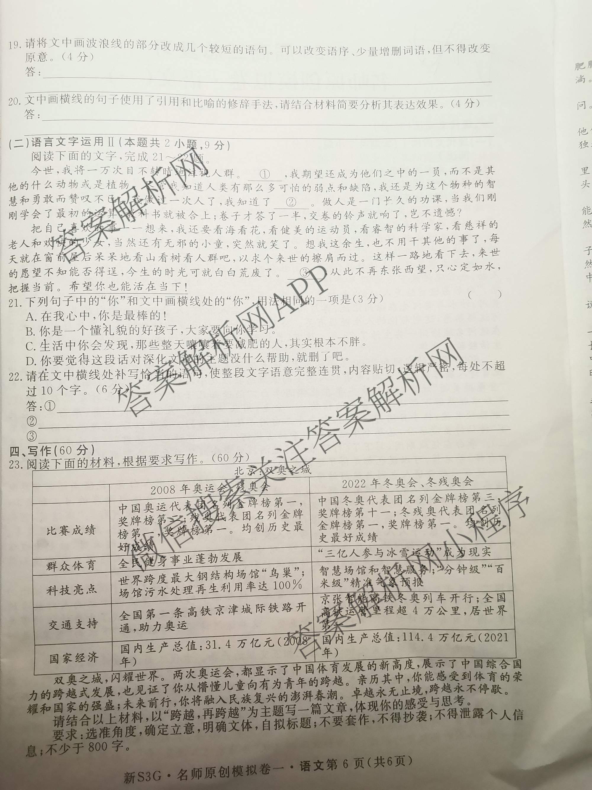 2023届高三总复习·新S3G名师原创模拟语文(一)1试题,目前分科卷答案网已经汇总了2023届高三总复习·新S3G名师原创模拟语文(一)1试题的各科答案和试卷,获取更多高三总复习·名师原创模拟答案解析,请在关注本站。