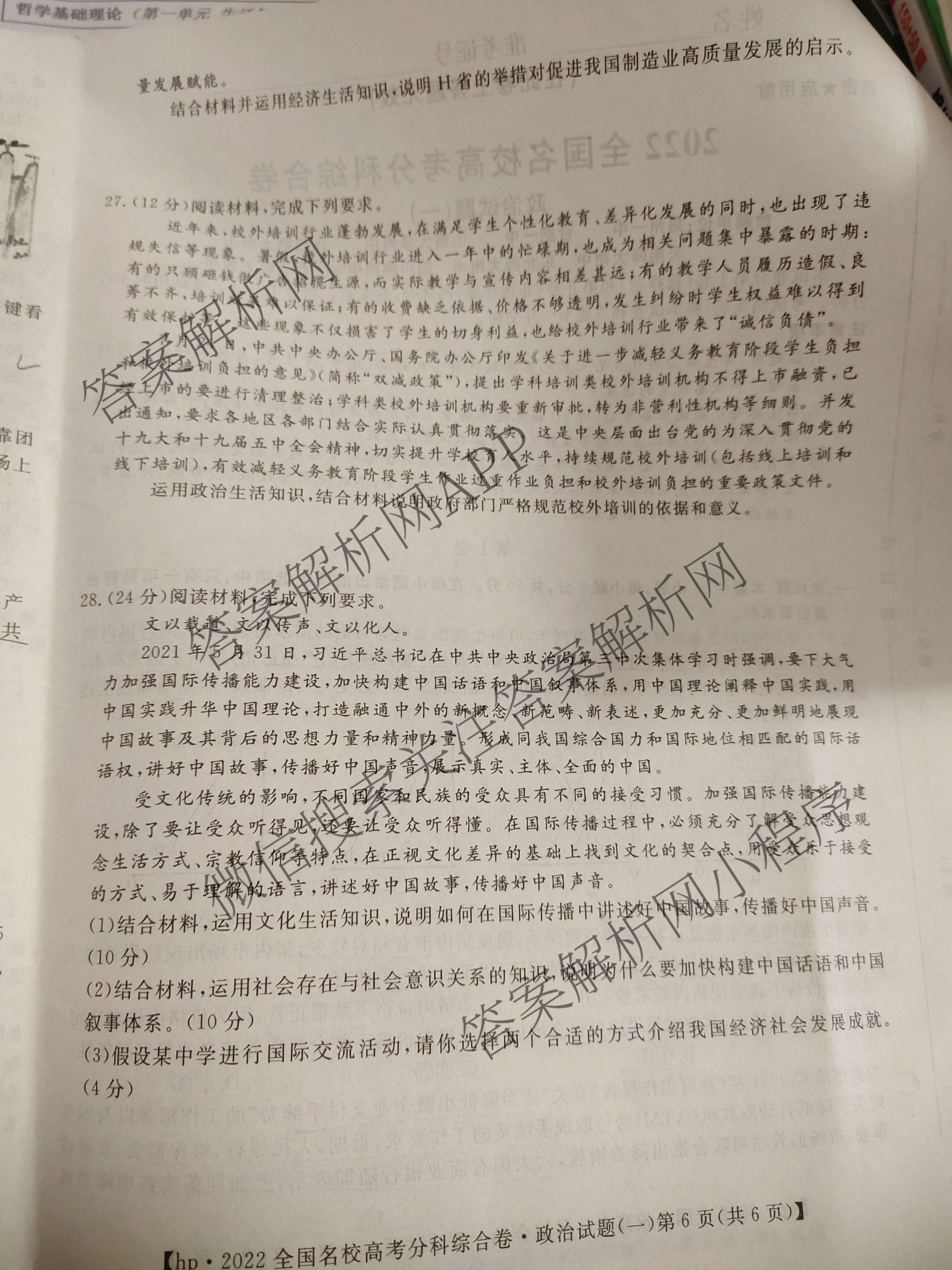 - 高三(华普教育)2022全国名校高考分科综合卷(一)1政治答案