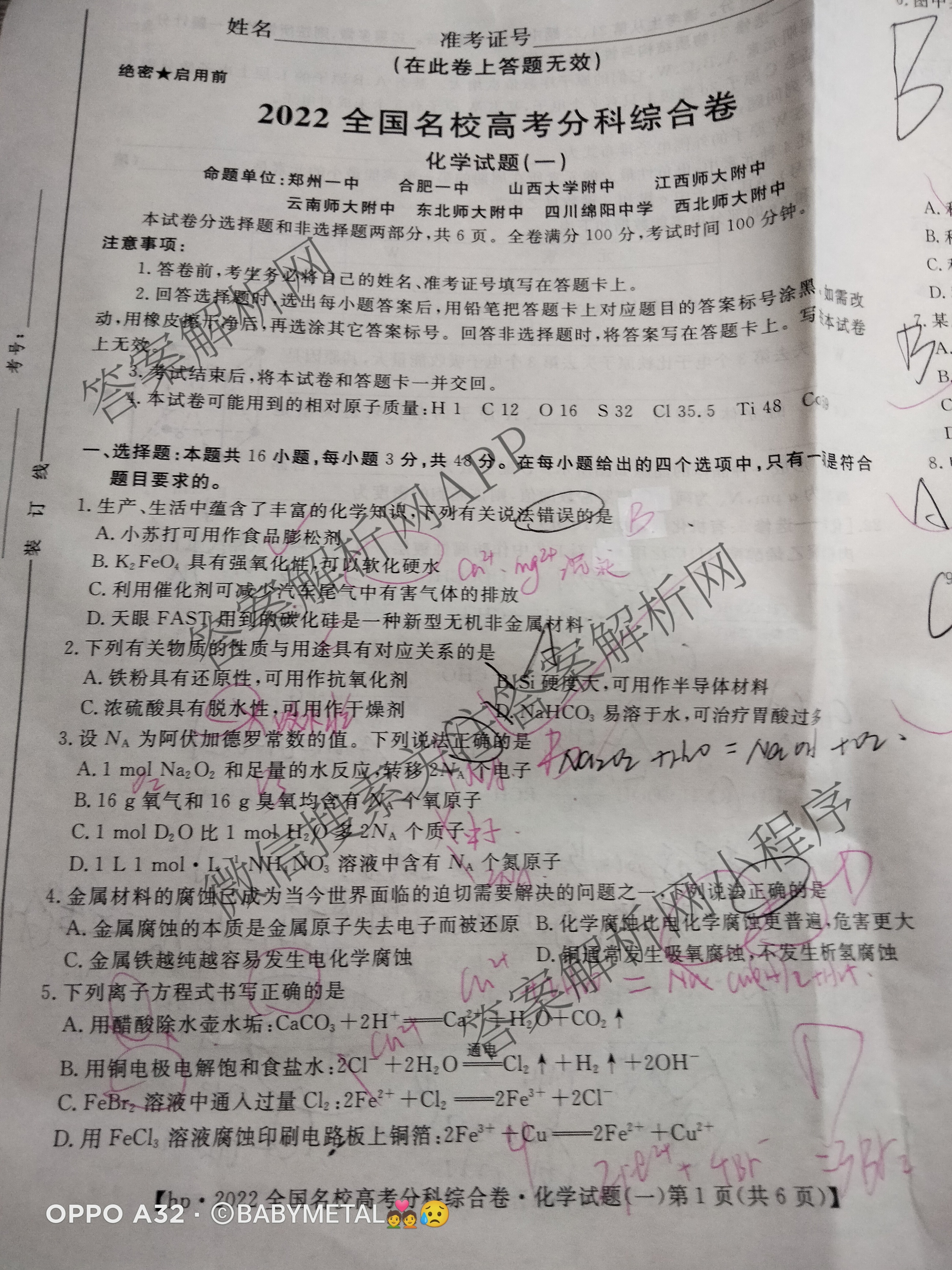 - (高三)[华普教育]·2022全国名校高考分科综合卷(一)1化学试题