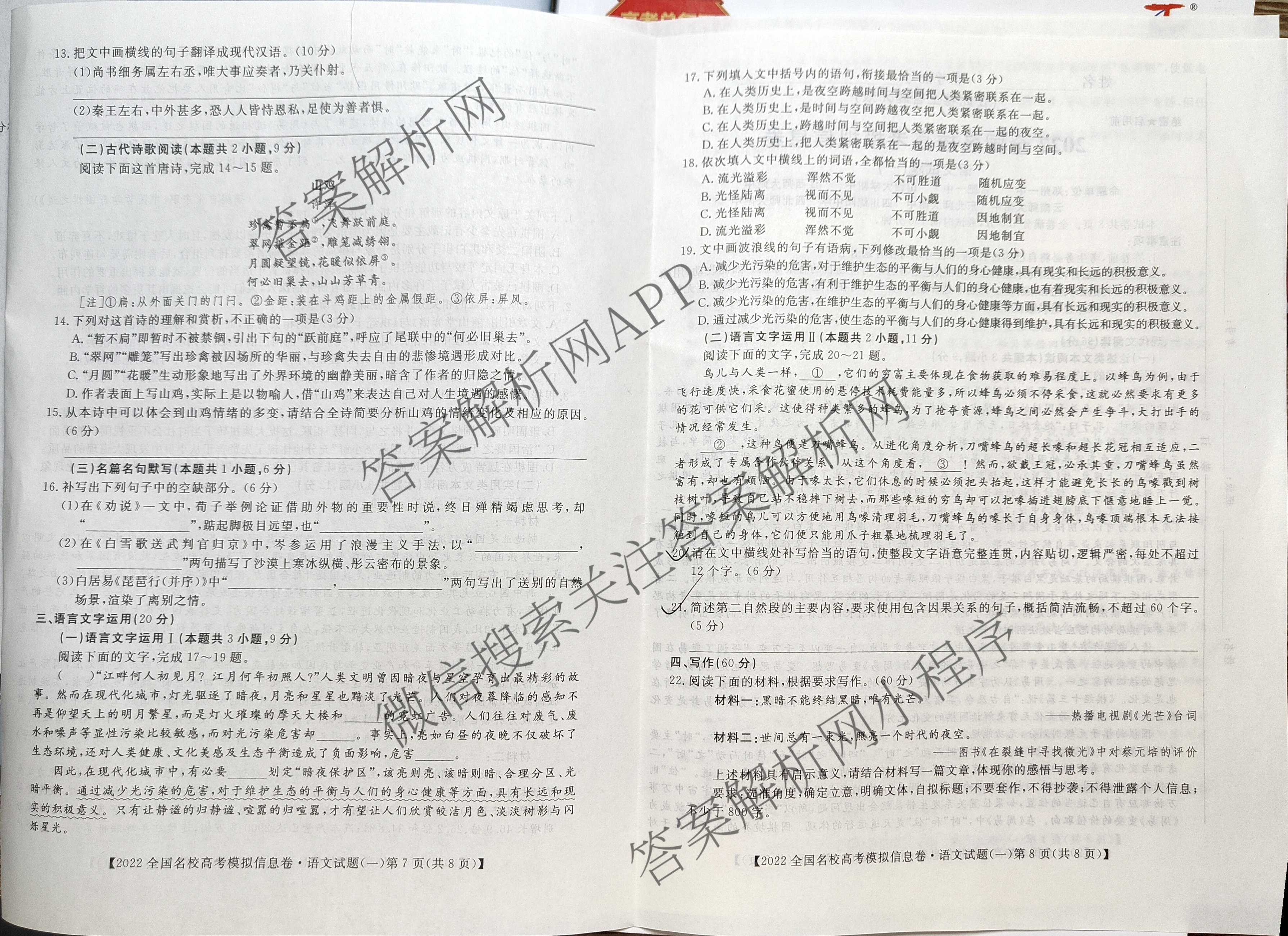 - [高三](华普教育)2022全国名校高考模拟信息卷(一)语文试题