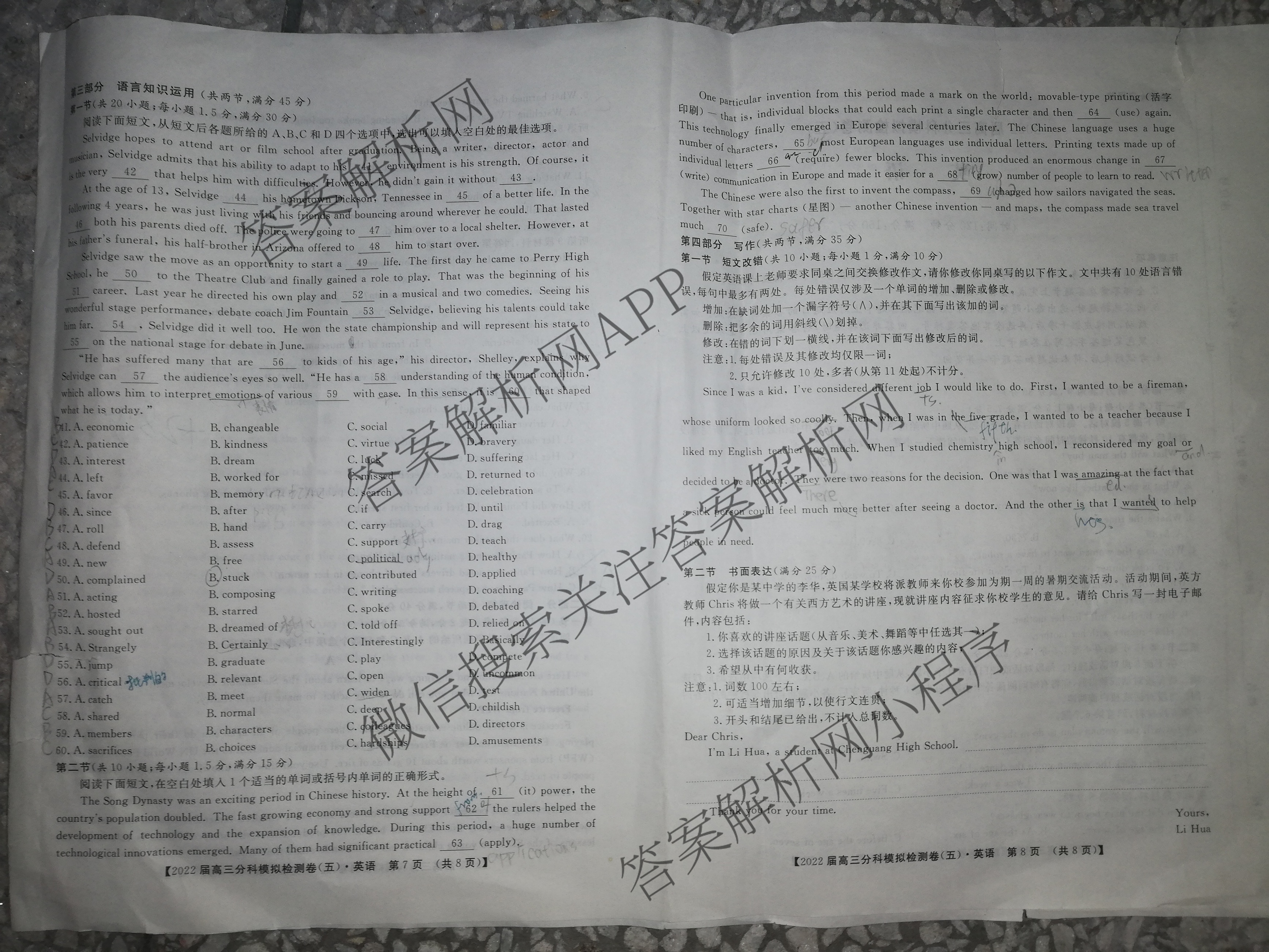 2022届高三分科模拟检测卷(五)英语试题,目前分科卷答案网已经汇总了2022届高三分科模拟检测卷(五)英语试题的各科答案和试卷,获取更多高三分科模拟检测卷答案解析,请在关注本站。