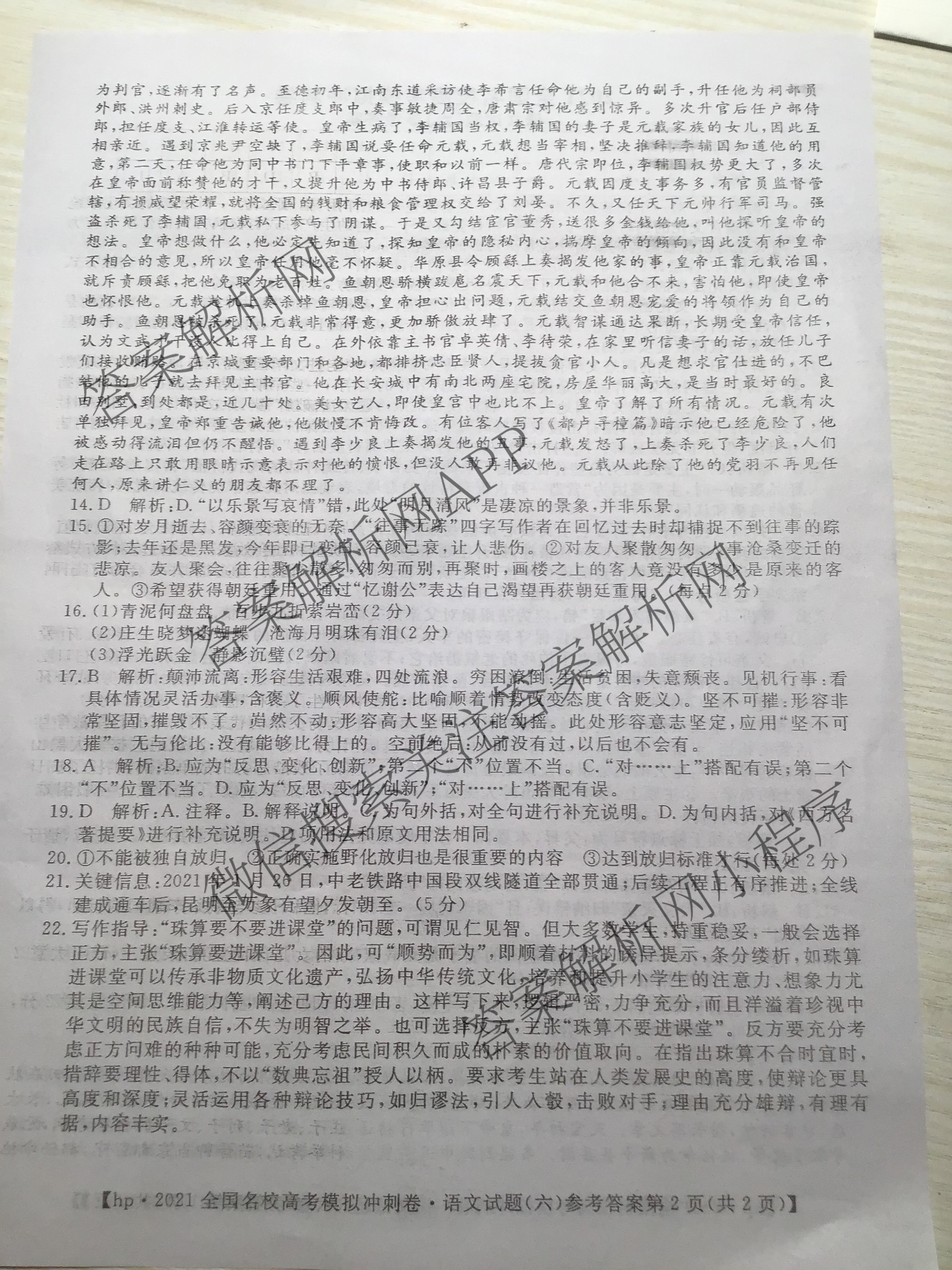 - [华普教育]2021全国名校高考模拟冲刺卷(六)语文答案
