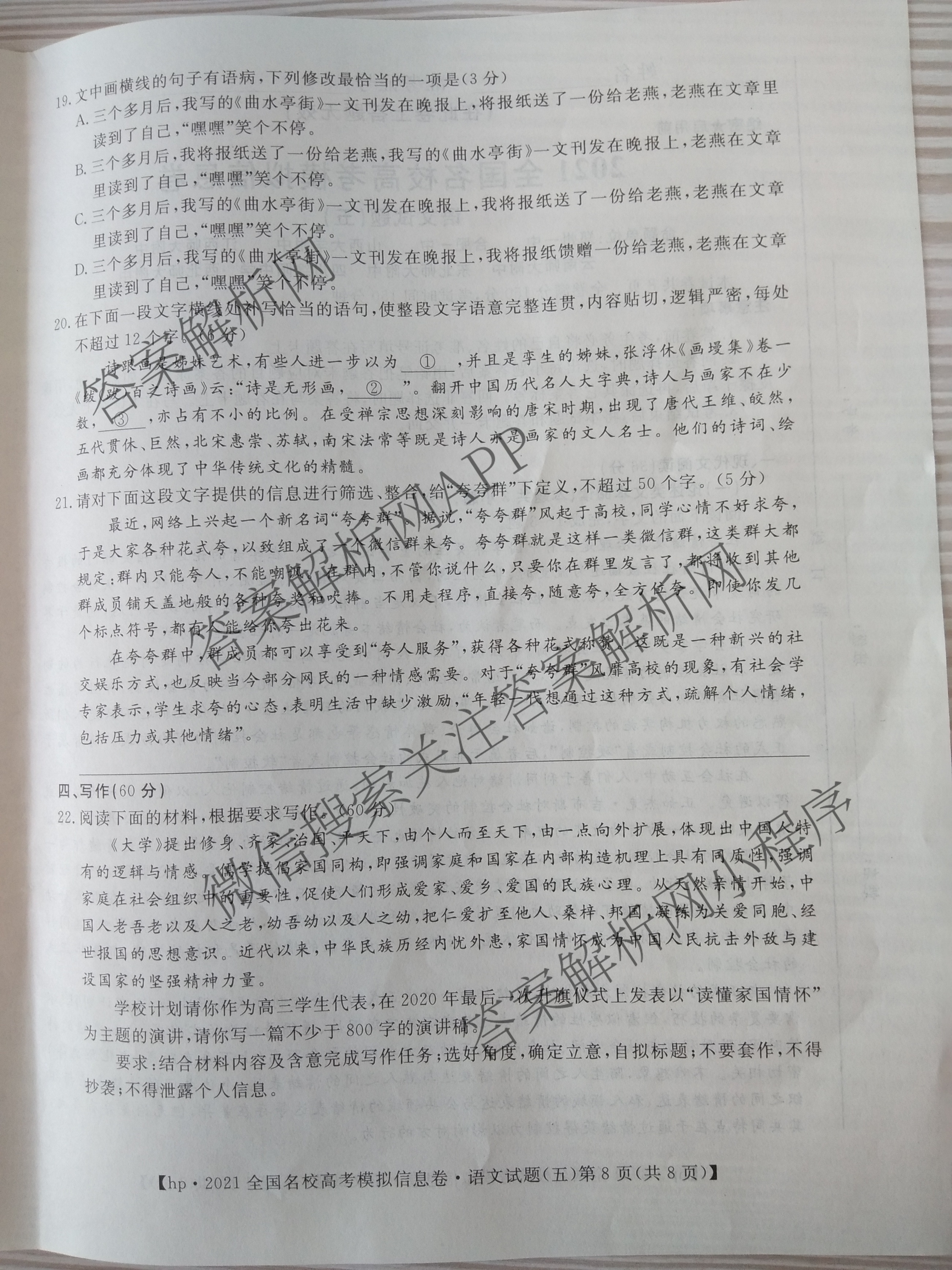 华普教育·2021全国名校高考模拟信息卷(五)语文试题,目前分科卷答案网已经汇总了华普教育·2021全国名校高考模拟信息卷(五)语文试题的各科答案和试卷,获取更多华普教育答案解析,请在关注本站。