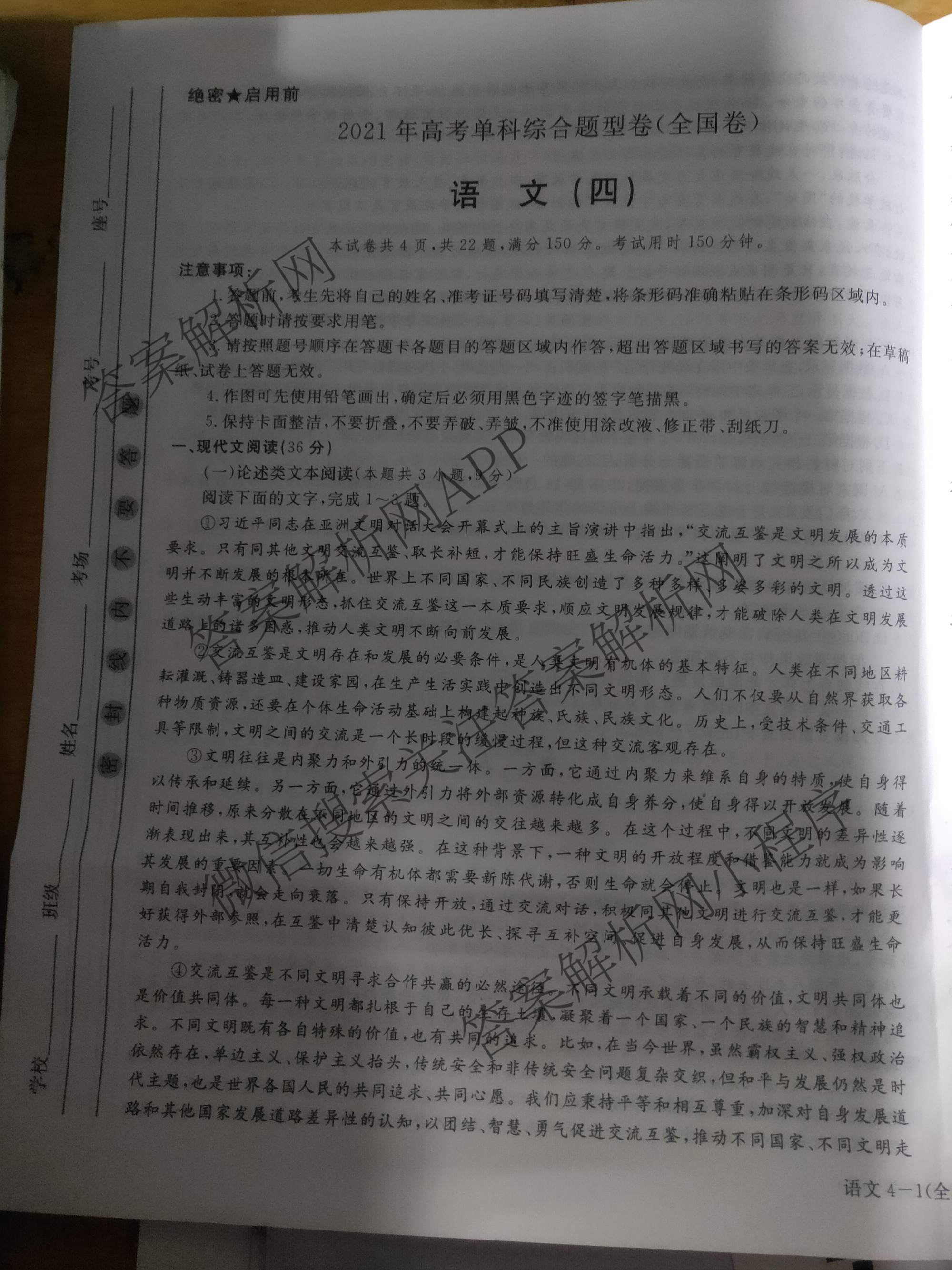 - 2021年高考单科综合题型卷(全国卷)四语文答案