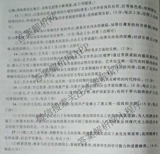 2021年高考单科综合题型卷(全国卷)五历史答案